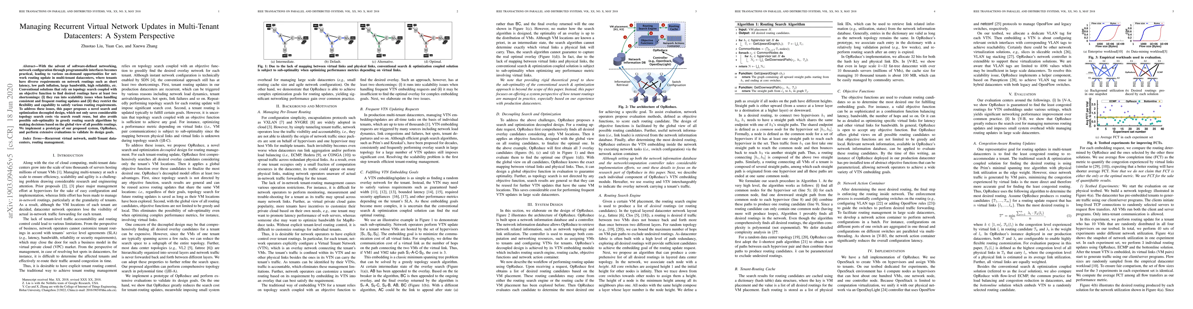 This paper proposes a novel system, OpReduce, to manage recurrent virtual network updates in multi-tenant datacenters by decoupling search and optimization, aiming to address scalability and flexibility issues in conventional routing solutions. Extensive evaluations validate the system's efficiency in reducing topology search costs and improving routing satisfaction.