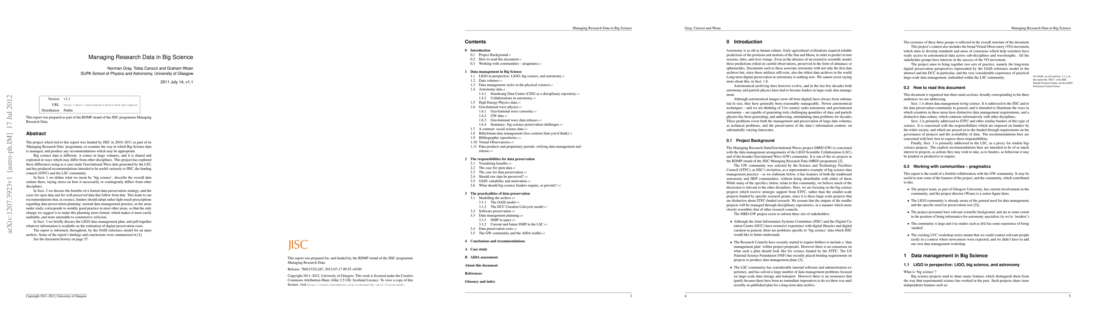 This paper funded by JISC examines how big science data, exemplified by Gravitational Wave data from the LSC, is managed and recommends formalizing data preservation planning to improve auditability and constructive criticism, while noting that current practices are already good. The report uses the OAIS reference model for open archiving throughout.