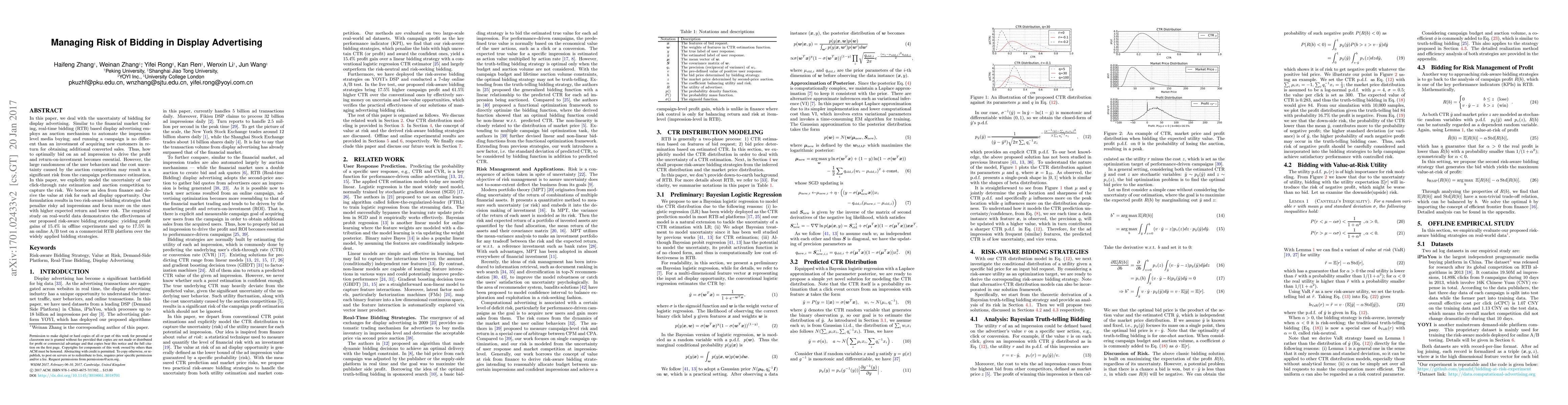 This paper develops risk-aware bidding strategies for real-time bidding in display advertising, modeling uncertainty in user behaviors and auction competition to optimize profit and ROI. Empirical results show a 15.4% profit gain in offline tests and up to 17.5% in an online A/B test compared to standard strategies.