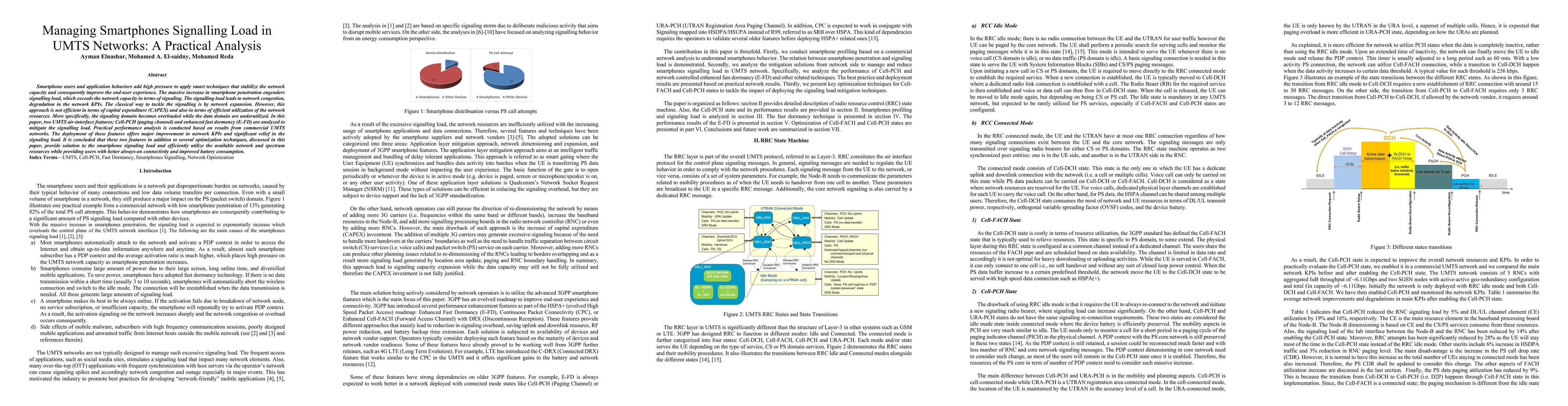 This paper analyzes UMTS network techniques to manage smartphone signaling load, focusing on Cell-PCH and enhanced fast dormancy. These features significantly reduce signaling load and improve network KPIs, offering a cost-effective alternative to network expansion.
