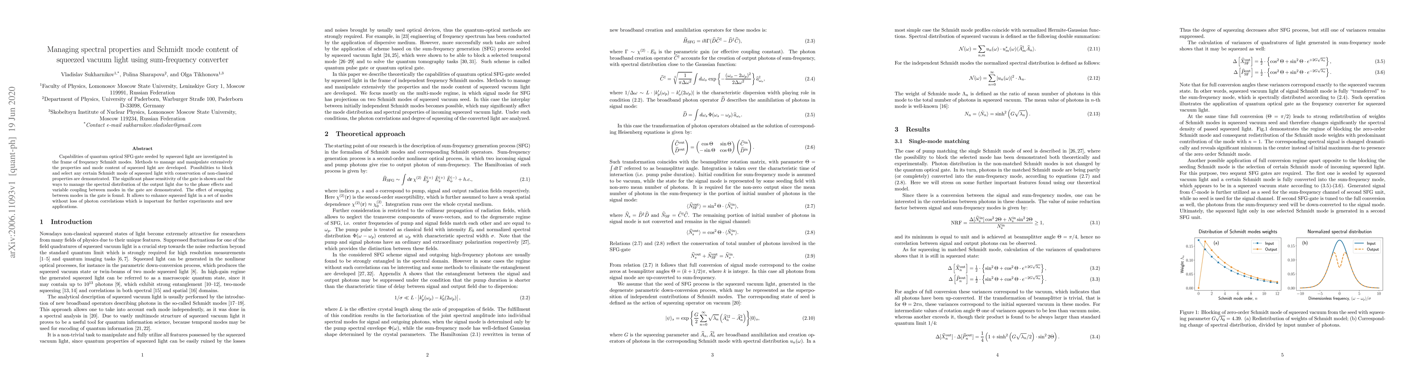 Capabilities of quantum optical SFG-gate seeded by squeezed light are investigated in the frame of frequency Schmidt modes. Methods to manage and manipulate extensively the properties and mode content of squeezed light are developed. Possibilities to block and select any certain Schmidt mode of squeezed light with conservation of non-classical properties are demonstrated. The significant phase sensitivity of the gate is shown and the ways to manage the spectral distribution of the output light due to the phase effects and variable coupling between modes in the gate are demonstrated. The effect of swapping between modes in the gate is found. It allows to enhance squeezed light in a set of modes without loss of photon correlations which is important for further experiments and new applications.
