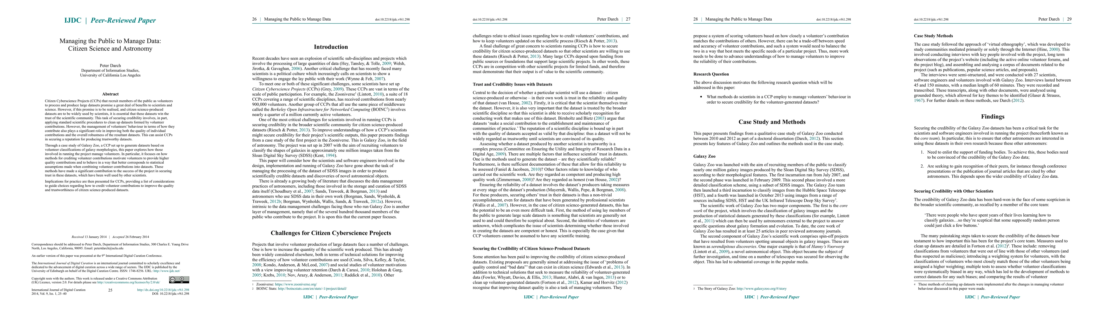 The paper presents a detailed examination of Galaxy Zoo's volunteer management strategies, emphasizing the role of egalitarian crediting methods in enhancing data quality and credibility.