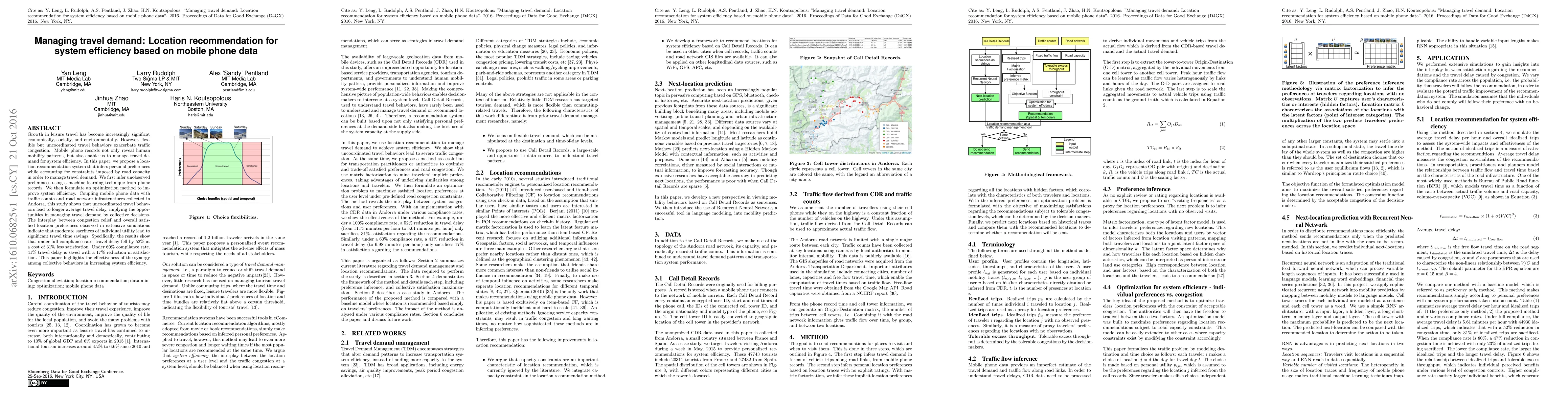 This paper proposes a location recommendation system using mobile phone data to manage travel demand and reduce traffic congestion. The system infers personal preferences and optimizes travel routes based on road capacity, demonstrating significant travel delay reductions at moderate costs to individual satisfaction.