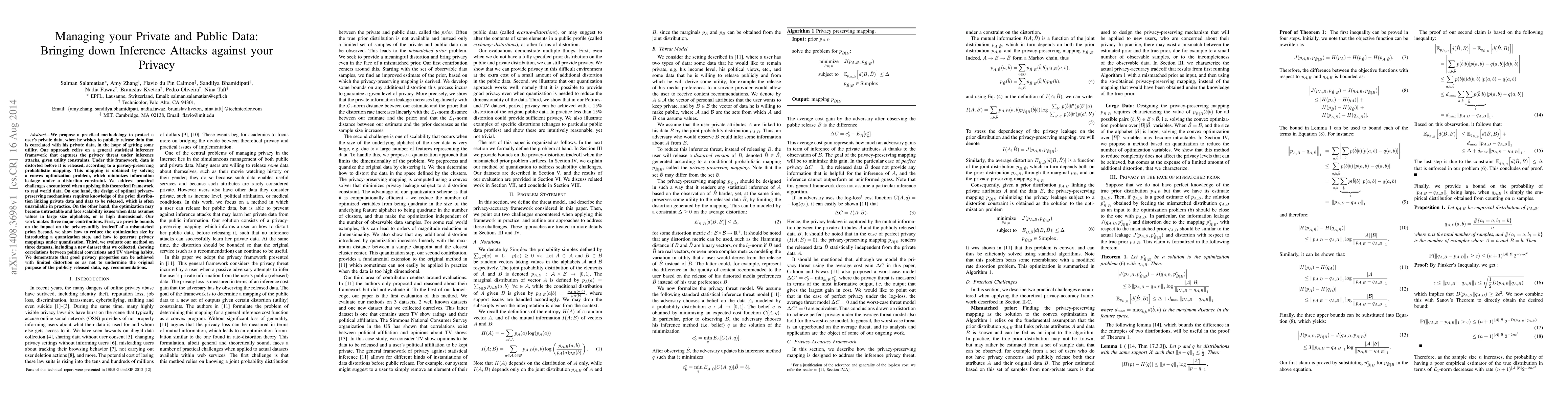 We propose a practical methodology to protect a user's private data, when he wishes to publicly release data that is correlated with his private data, in the hope of getting some utility. Our approach relies on a general statistical inference framework that captures the privacy threat under inference attacks, given utility constraints. Under this framework, data is distorted before it is released, according to a privacy-preserving probabilistic mapping. This mapping is obtained by solving a convex optimization problem, which minimizes information leakage under a distortion constraint. We address practical challenges encountered when applying this theoretical framework to real world data. On one hand, the design of optimal privacy-preserving mechanisms requires knowledge of the prior distribution linking private data and data to be released, which is often unavailable in practice. On the other hand, the optimization may become untractable and face scalability issues when data assumes values in large size alphabets, or is high dimensional. Our work makes three major contributions. First, we provide bounds on the impact on the privacy-utility tradeoff of a mismatched prior. Second, we show how to reduce the optimization size by introducing a quantization step, and how to generate privacy mappings under quantization. Third, we evaluate our method on three datasets, including a new dataset that we collected, showing correlations between political convictions and TV viewing habits. We demonstrate that good privacy properties can be achieved with limited distortion so as not to undermine the original purpose of the publicly released data, e.g. recommendations.