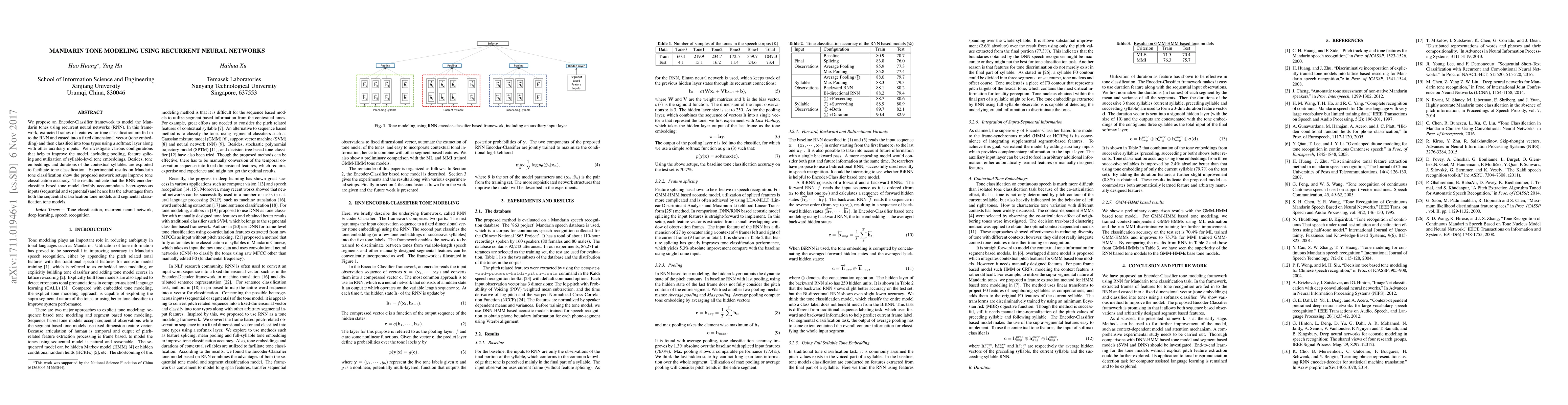 This paper proposes an Encoder-Classifier framework using recurrent neural networks to model Mandarin tones, achieving improved tone classification accuracy through various configurations like pooling and feature splicing. The model effectively integrates sequential and segmental inputs, enhancing its performance.
