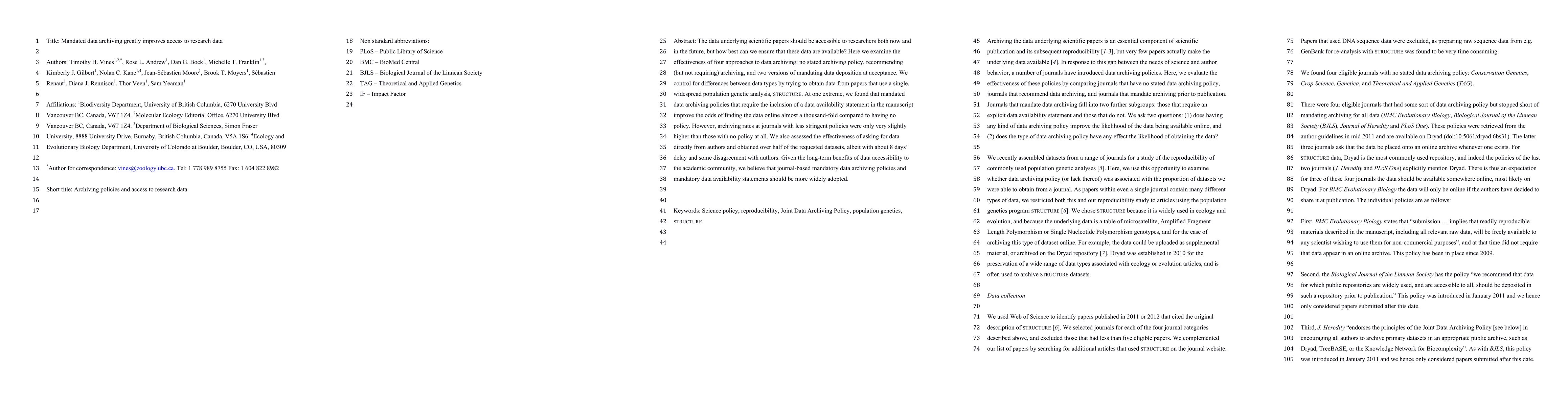 The data underlying scientific papers should be accessible to researchers both now and in the future, but how best can we ensure that these data are available? Here we examine the effectiveness of four approaches to data archiving: no stated archiving policy, recommending (but not requiring) archiving, and two versions of mandating data deposition at acceptance. We control for differences between data types by trying to obtain data from papers that use a single, widespread population genetic analysis, STRUCTURE. At one extreme, we found that mandated data archiving policies that require the inclusion of a data availability statement in the manuscript improve the odds of finding the data online almost a thousand-fold compared to having no policy. However, archiving rates at journals with less stringent policies were only very slightly higher than those with no policy at all. At one extreme, we found that mandated data archiving policies that require the inclusion of a data availability statement in the manuscript improve the odds of finding the data online almost a thousand fold compared to having no policy. However, archiving rates at journals with less stringent policies were only very slightly higher than those with no policy at all. We also assessed the effectiveness of asking for data directly from authors and obtained over half of the requested datasets, albeit with about 8 days delay and some disagreement with authors. Given the long term benefits of data accessibility to the academic community, we believe that journal based mandatory data archiving policies and mandatory data availability statements should be more widely adopted.