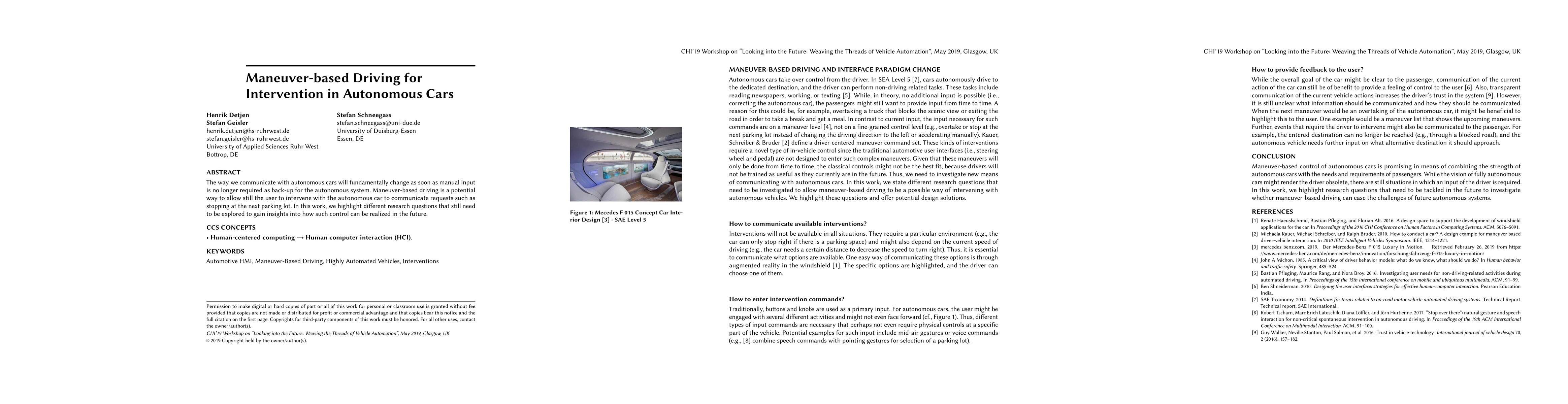 The way we communicate with autonomous cars will fundamentally change as soon as manual input is no longer required as back-up for the autonomous system. Maneuver-based driving is a potential way to allow still the user to intervene with the autonomous car to communicate requests such as stopping at the next parking lot. In this work, we highlight different research questions that still need to be explored to gain insights into how such control can be realized in the future.