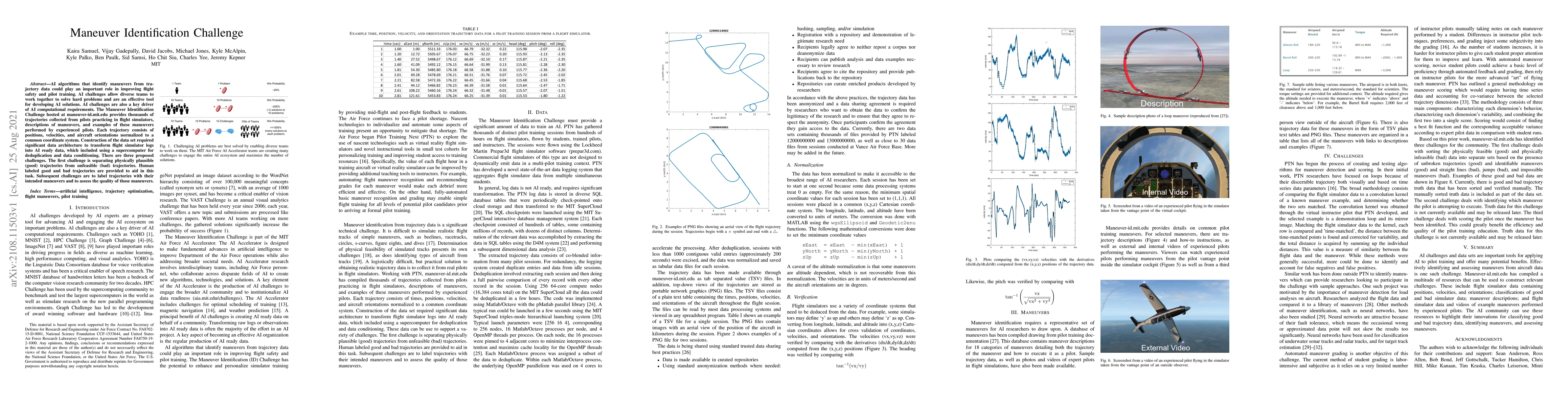 The Maneuver Identification Challenge aims to develop AI algorithms for identifying maneuvers from flight simulator trajectory data to enhance flight safety and pilot training. The challenge involves separating physically plausible trajectories from unfeasible ones, labeling trajectories with intended maneuvers, and assessing maneuver quality.