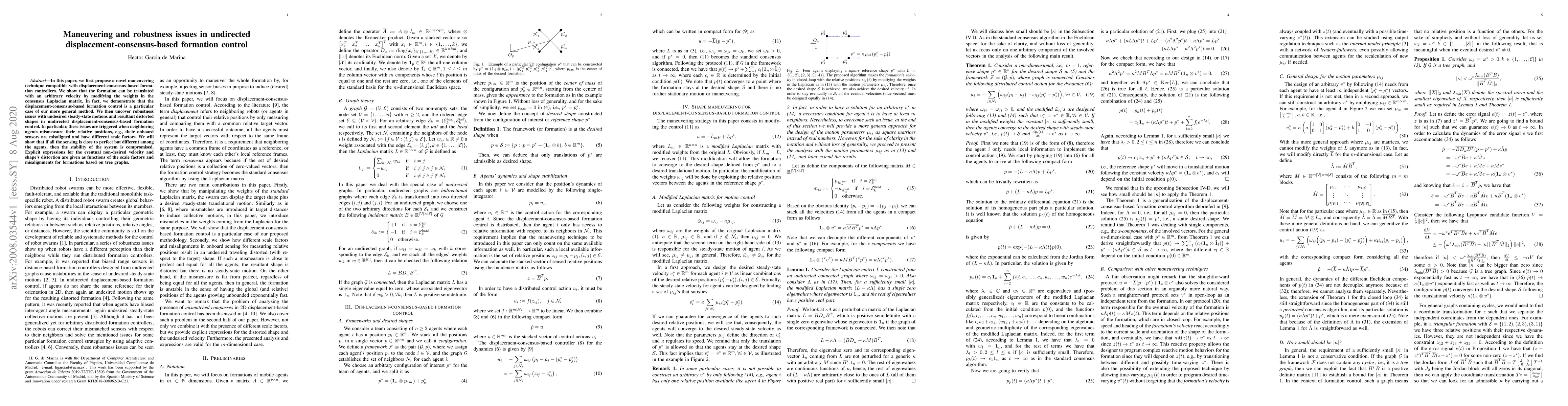 In this paper, we first propose a novel maneuvering technique compatible with displacement-consensus-based formation controllers. We show that the formation can be translated with an arbitrary velocity by modifying the weights in the consensus Laplacian matrix. In fact, we demonstrate that the displacement-consensus-based formation control is a particular case of our more general method. We then uncover robustness issues with undesired steady-state motions and resultant distorted shapes in undirected displacement-consensus-based formation control. In particular, these issues are triggered when neighboring agents mismeasure their relative positions, e.g., their onboard sensors are misaligned and have different scale factors. We will show that if all the sensing is close to perfect but different among the agents, then the stability of the system is compromised. Explicit expressions for the eventual non-desired velocity and shape's distortion are given as functions of the scale factors and misalignments for formations based on tree graphs.