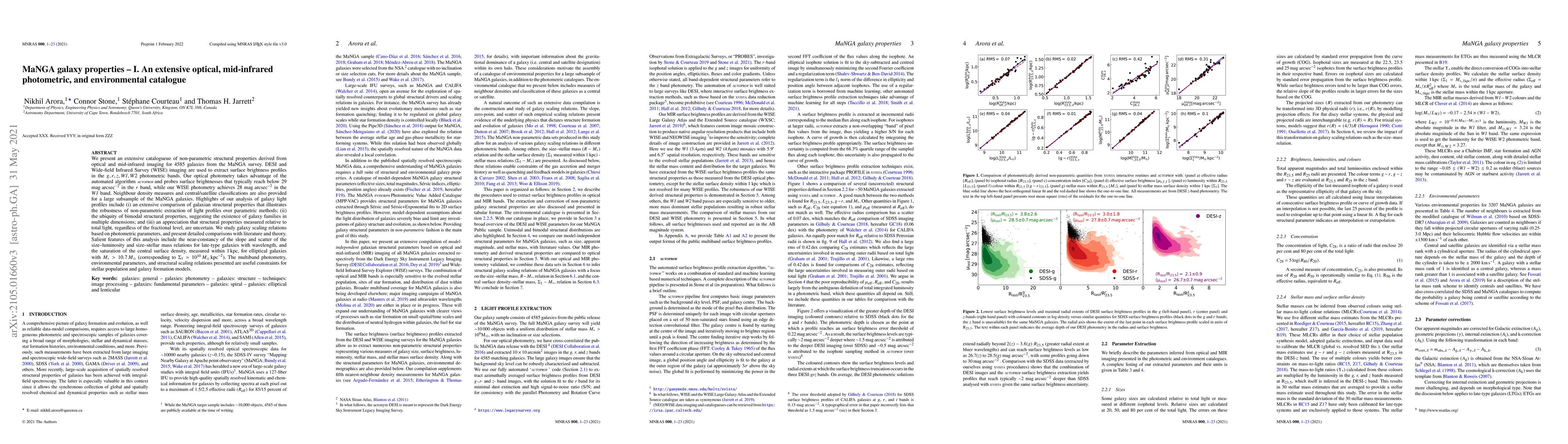 This paper presents a comprehensive catalog of structural properties for 4585 galaxies from the MaNGA survey, derived from optical and mid-infrared imaging. It highlights the non-parametric extraction of light profiles, the existence of galaxy families, and the robustness of galaxy scaling relations across different wavelengths.