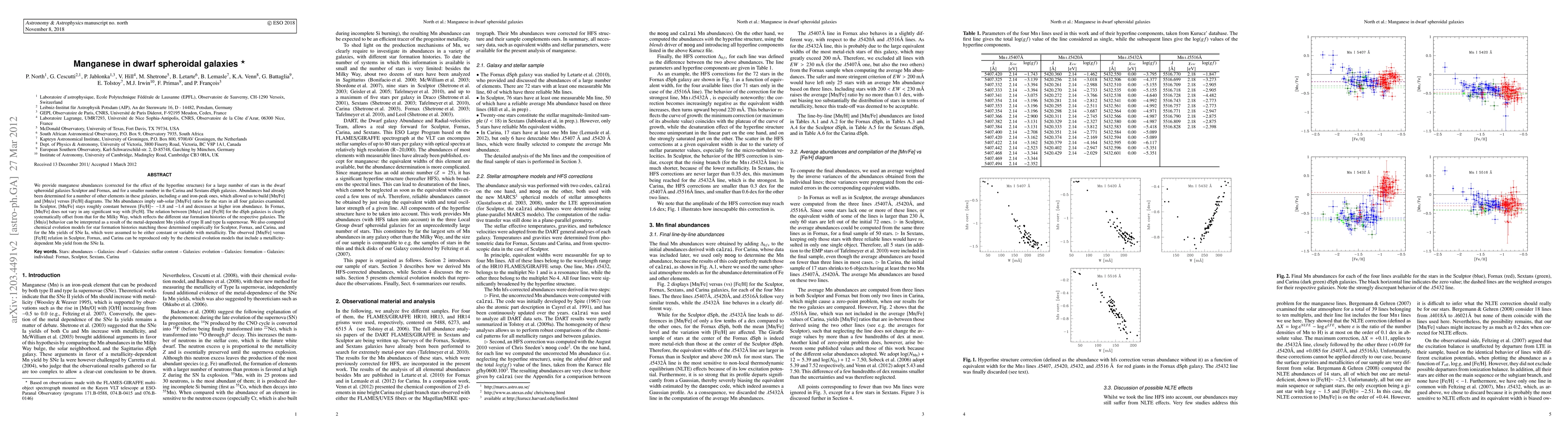 This paper investigates manganese abundances in dwarf spheroidal galaxies Sculptor, Fornax, Carina, and Sextans, revealing sub-solar [Mn/Fe] ratios. The study shows that the [Mn/Fe] ratio in Sculptor remains constant at lower iron abundances but decreases at higher iron levels, while Fornax shows no significant variation. The [Mn/alpha] behavior differs from the Milky Way, indicating distinct star formation histories, and chemical evolution models confirm the need for metallicity-dependent Mn yields from type Ia supernovae to match observations.