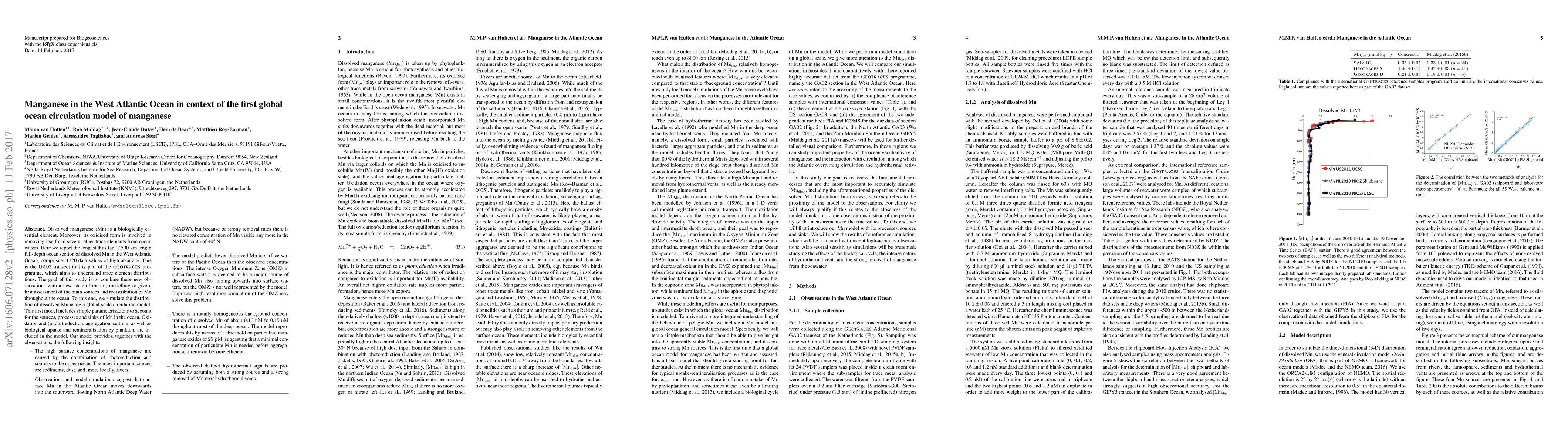 This study combines new GEOTRACES measurements with a global ocean circulation model to analyze manganese distribution, revealing that surface Mn is driven by photoreduction and sources like dust and sediments, while it does not propagate southward due to strong removal rates.