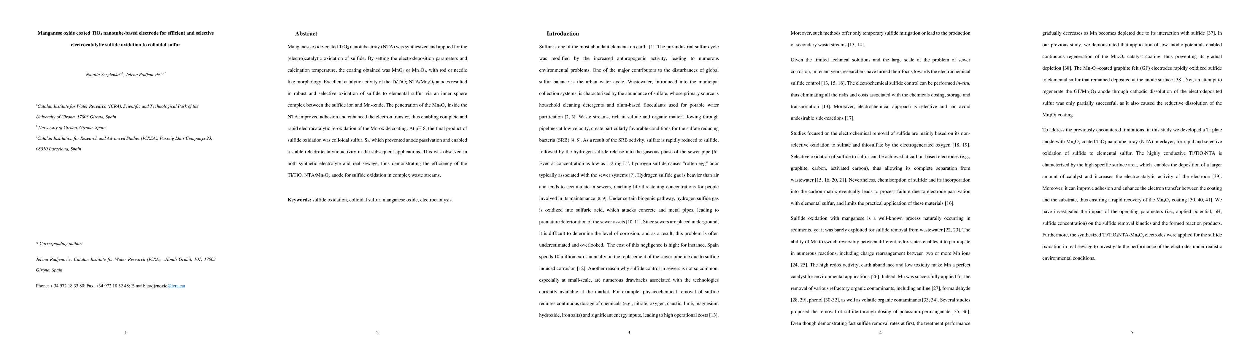 This paper presents a manganese oxide-coated TiO2 nanotube array electrode for efficient sulfide oxidation to colloidal sulfur. The MnxOy coating enhances electron transfer and maintains stable catalytic activity, producing S8 sulfur in both synthetic and real sewage environments.