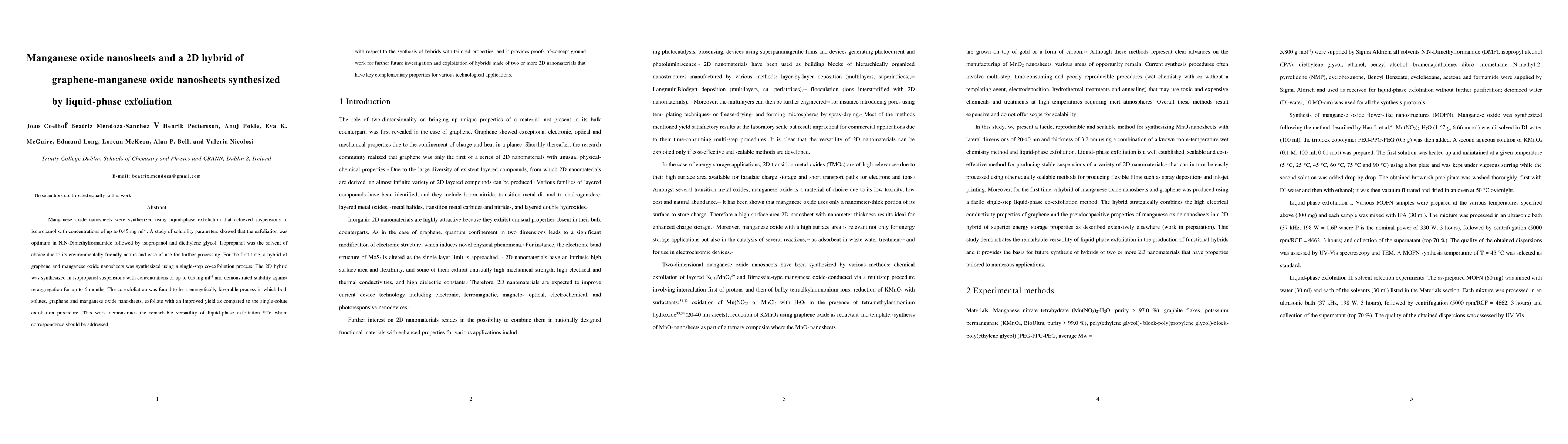 This paper synthesizes manganese oxide nanosheets and a 2D hybrid of graphene-manganese oxide nanosheets using liquid-phase exfoliation, achieving stable suspensions in isopropanol. The study highlights the versatility of this method and its potential for creating hybrid materials with tailored properties for future technological applications.