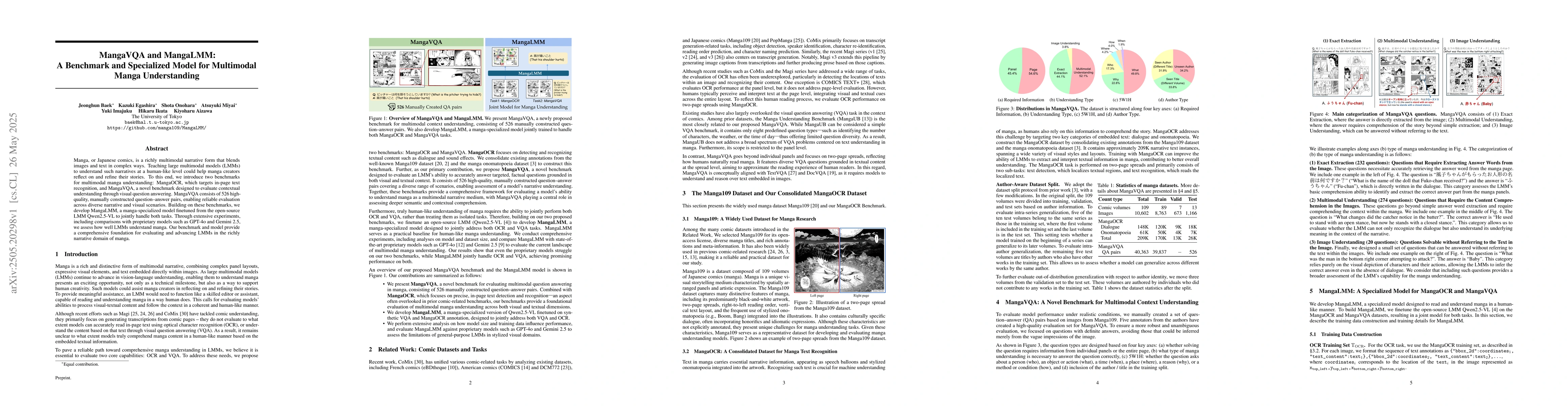 MangaOCR and MangaVQA benchmarks, along with the manga-specialized model MangaLMM finetuned from Qwen2.5-VL for joint text and visual understanding in manga.