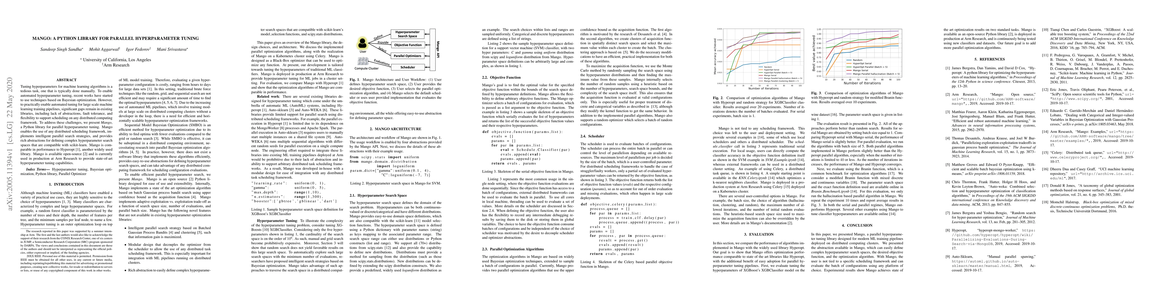 Mango is a Python library for parallel hyperparameter tuning that enables the use of any distributed scheduling framework, implements intelligent parallel search strategies, and provides abstractions for complex search spaces compatible with scikit-learn.