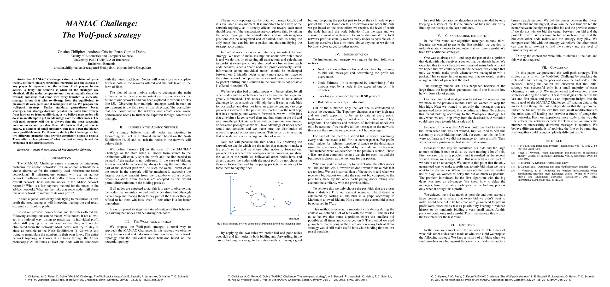 MANIAC Challenge raises a problem of game theory, different players strategies intertwine and the success of any player is dependent on the actions of all players in the system. A truly fair scenario is when all the strategies are identical, all the nodes co-operate and they all equally share the rewards and risks that come with every transfer. A successful strategy is one that tries to diverge from the equilibrium to maximize its own gains and it manages to do so. We propose the wolf-pack strategy. Unlike standard game-theory based strategies, our strategy does not penalize the nodes that diverge from fairness or from equilibrium, as we believe most nodes will do so in an attempt to get an advantage over the other nodes. The wolf-pack strategy will try to always find the most successful node or nodes and penalize them. We believe that just like in nature, a number of small predators can take down the bigger, more profitable ones. Furthermore during the Challenge we test two different strategies that provide completely opposite results. These offer a clear picture of what the best strategy is and the problems of the current system.