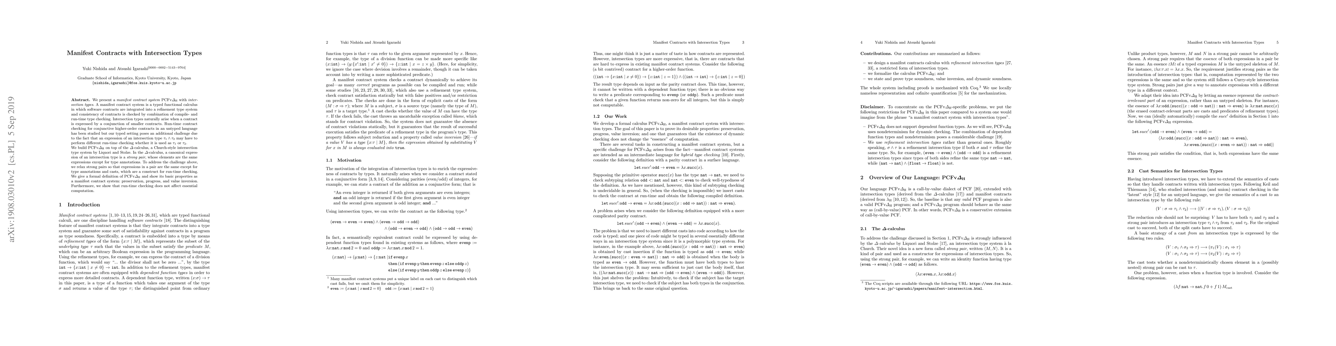 We present a manifest contract system PCFv$\Delta$H with intersection types. A manifest contract system is a typed functional calculus in which software contracts are integrated into a refinement type system and consistency of contracts is checked by combination of compile- and run-time type checking. Intersection types naturally arise when a contract is expressed by a conjunction of smaller contracts. Run-time contract checking for conjunctive higher-order contracts in an untyped language has been studied but our typed setting poses an additional challenge due to the fact that an expression of an intersection type $\tau_1 \wedge \tau_2$ may have to perform different run-time checking whether it is used as $\tau_1$ or $\tau_2$. We build PCFv$\Delta$H on top of the $\Delta$-calculus, a Church-style intersection type system by Liquori and Stolze. In the $\Delta$-calculus, a canonical expression of an intersection type is a strong pair, whose elements are the same expressions except for type annotations. To address the challenge above, we relax strong pairs so that expressions in a pair are the same except for type annotations and casts, which are a construct for run-time checking. We give a formal definition of PCFv$\Delta$H and show its basic properties as a manifest contract system: preservation, progress, and value inversion. Furthermore, we show that run-time checking does not affect essential computation.