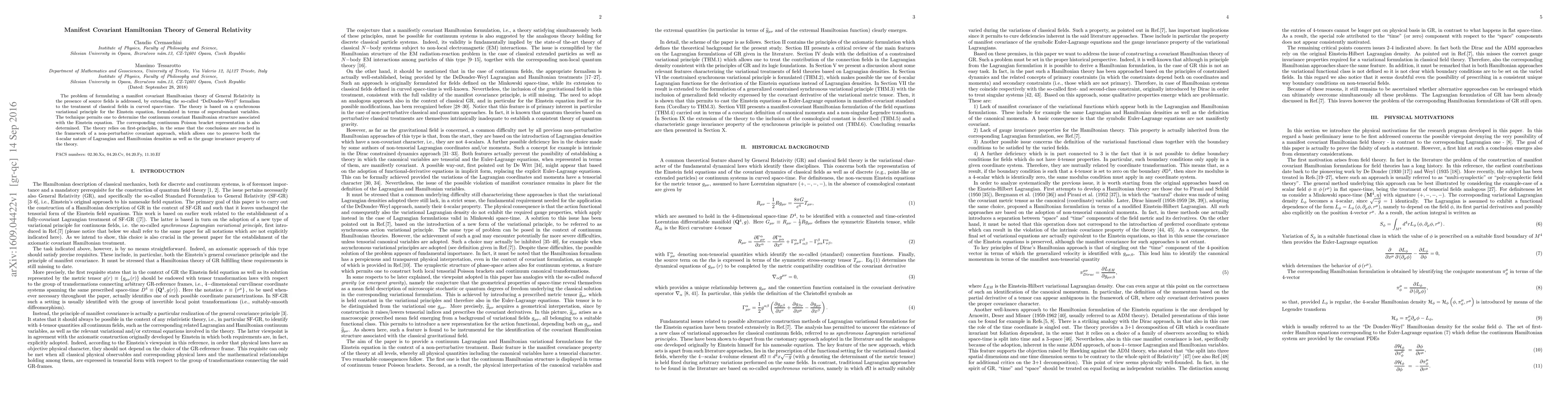 This paper develops a covariant Hamiltonian theory for General Relativity using the DeDonder-Weyl formalism, extending it to classical fields in curved spacetime. The approach preserves gauge invariance and the scalar nature of Lagrangian and Hamiltonian densities through a non-perturbative, covariant method.