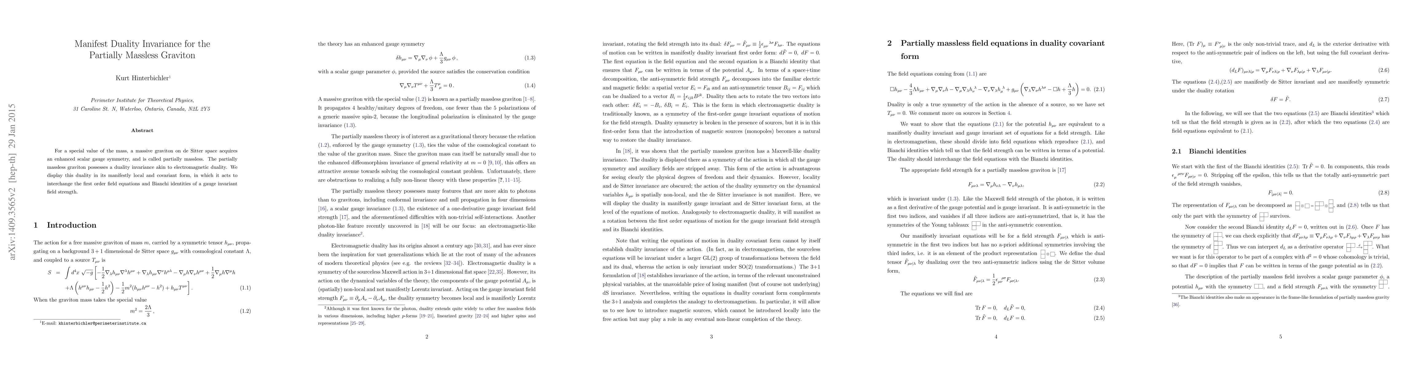 For a special value of the mass, a massive graviton on de Sitter space acquires an enhanced scalar gauge symmetry, and is called partially massless. The partially massless graviton possesses a duality invariance akin to electromagnetic duality. We display this duality in its manifestly local and covariant form, in which it acts to interchange the first order field equations and Bianchi identities of a gauge invariant field strength.