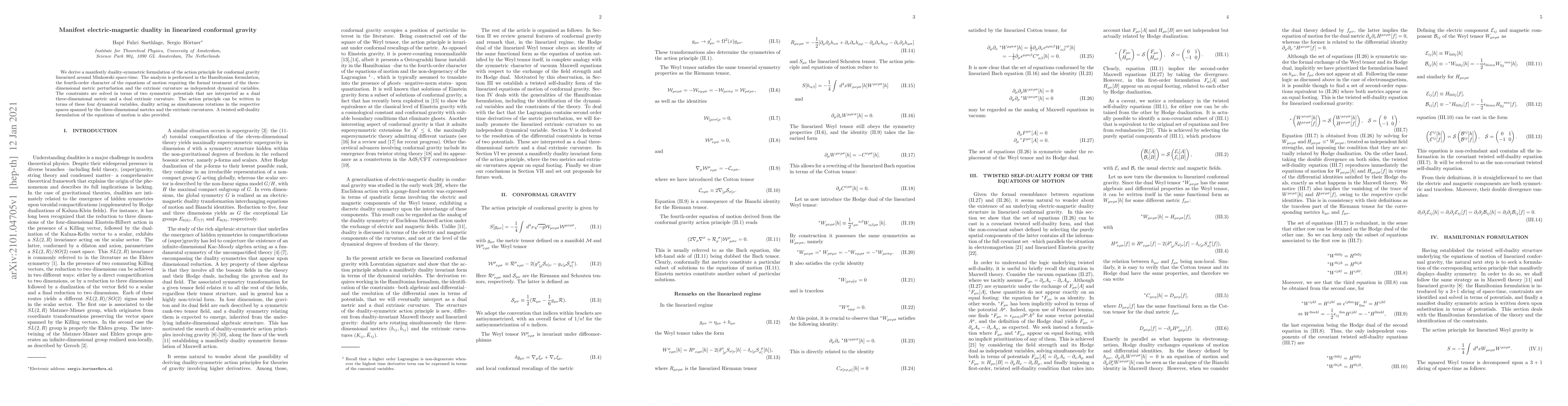 We derive a manifestly duality-symmetric formulation of the action principle for conformal gravity linearized around Minkowski space-time. The analysis is performed in the Hamiltonian formulation, the fourth-order character of the equations of motion requiring the formal treatment of the three-dimensional metric perturbation and the extrinsic curvature as independent dynamical variables. The constraints are solved in terms of two symmetric potentials that are interpreted as a dual three-dimensional metric and a dual extrinsic curvature. The action principle can be written in terms of these four dynamical variables, duality acting as simultaneous rotations in the respective spaces spanned by the three-dimensional metrics and the extrinsic curvatures. A twisted self-duality formulation of the equations of motion is also provided.