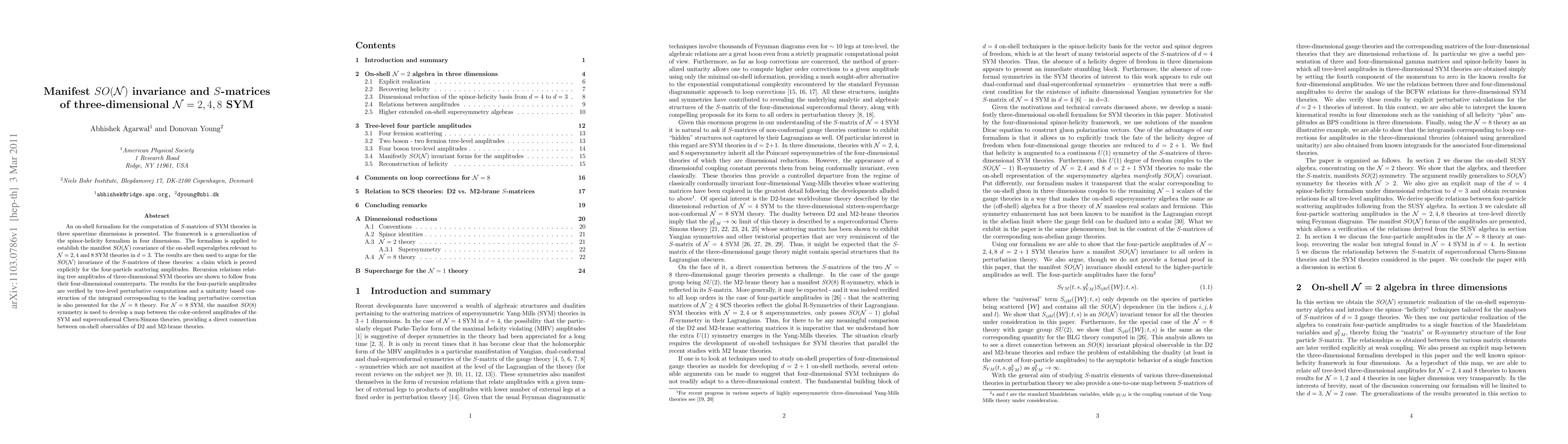 An on-shell formalism for the computation of S-matrices of SYM theories in three spacetime dimensions is presented. The framework is a generalization of the spinor-helicity formalism in four dimensions. The formalism is applied to establish the manifest SO(N) covariance of the on-shell superalgebra relevant to N =2,4 and 8 SYM theories in d=3. The results are then used to argue for the SO(N) invariance of the S-matrices of these theories: a claim which is proved explicitly for the four-particle scattering amplitudes. Recursion relations relating tree amplitudes of three-dimensional SYM theories are shown to follow from their four-dimensional counterparts. The results for the four-particle amplitudes are verified by tree-level perturbative computations and a unitarity based construction of the integrand corresponding to the leading perturbative correction is also presented for the N=8 theory. For N=8 SYM, the manifest SO(8) symmetry is used to develop a map between the color-ordered amplitudes of the SYM and superconformal Chern-Simons theories, providing a direct connection between on-shell observables of D2 and M2-brane theories.