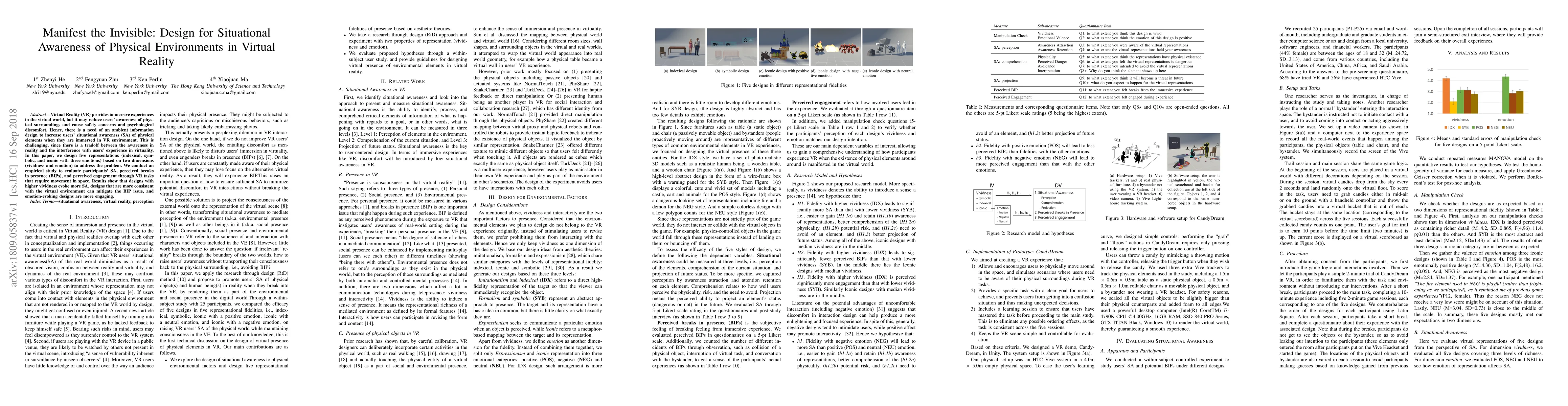Virtual Reality (VR) provides immersive experiences in the virtual world, but it may reduce users' awareness of physical surroundings and cause safety concerns and psychological discomfort. Hence, there is a need of an ambient information design to increase users' situational awareness (SA) of physical elements when they are immersed in VR environment. This is challenging, since there is a tradeoff between the awareness in reality and the interference with users' experience in virtuality. In this paper, we design five representations (indexical, symbolic, and iconic with three emotions) based on two dimensions (vividness and emotion) to address the problem. We conduct an empirical study to evaluate participants' SA, perceived breaks in presence (BIPs), and perceived engagement through VR tasks that require movement in space. Results show that designs with higher vividness evoke more SA, designs that are more consistent with the virtual environment can mitigate the BIP issue, and emotion-evoking designs are more engaging.