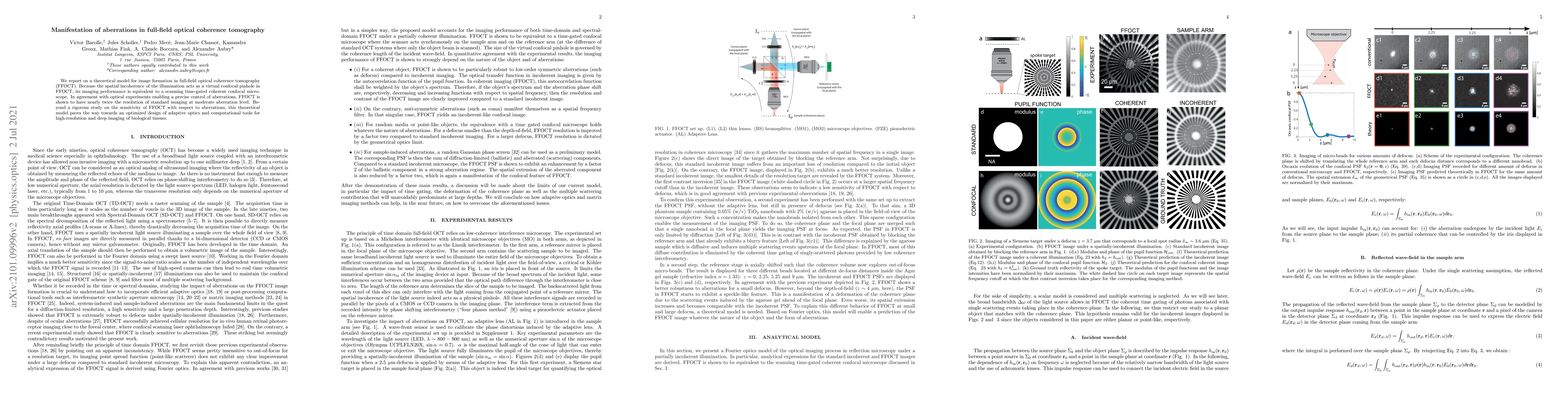 This paper presents a theoretical model for full-field optical coherence tomography (FFOCT), demonstrating its equivalent imaging performance to a scanning time-gated coherent confocal microscope. The study reveals FFOCT's nearly double resolution compared to standard imaging under moderate aberrations, paving the way for adaptive optics and computational tools for high-resolution deep imaging of biological tissues.