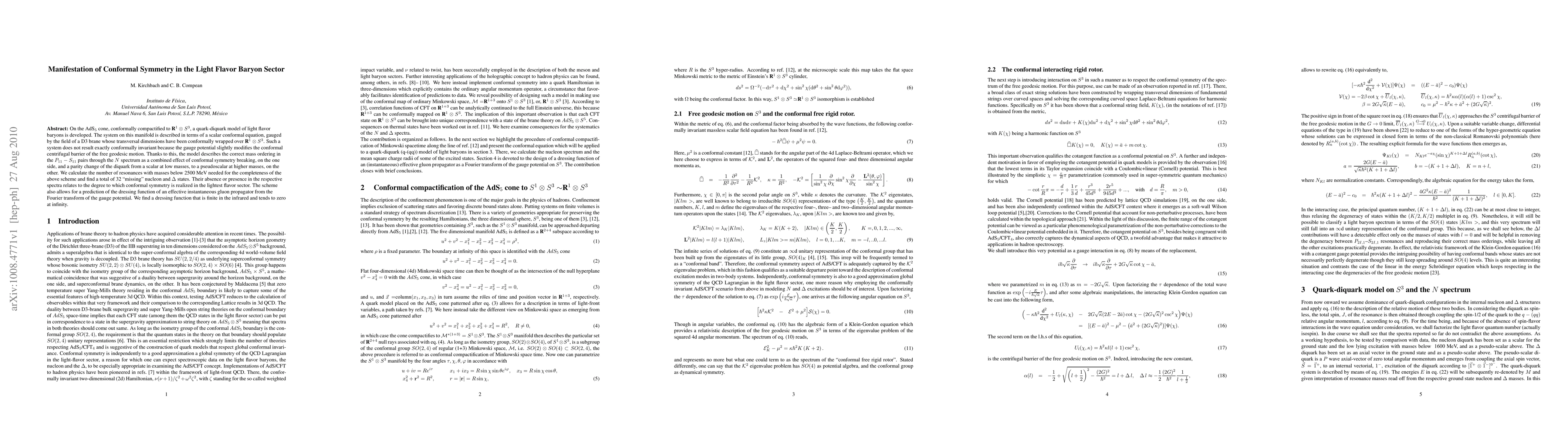 The paper presents a quark-diquark model for light flavor baryons on AdS_5 cone, compactified to R^1xS^3, describing the system via a scalar conformal equation gauged by a D3 brane's field. The model accounts for mass ordering in P11-S11 pairs and predicts 32 'missing' nucleon and Delta states below 2500 MeV, suggesting conformal symmetry realization in the lightest flavor sector. It also predicts a finite, infrared-finite dressing function for an effective instantaneous gluon propagator.