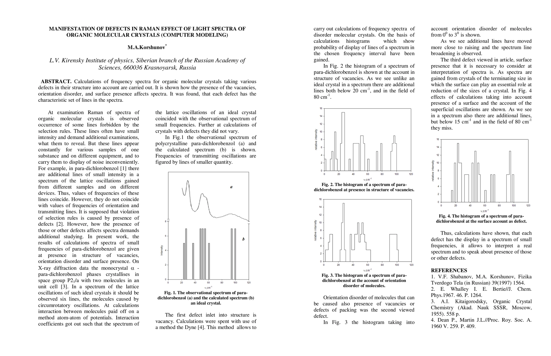 Calculations of frequency spectra for organic molecular crystals taking various defects in their structure into account are carried out. It is shown how the presence of the vacancies, orientation disorder, and surface presence affects spectra. It was found, that each defect has the characteristic set of lines in the spectra.