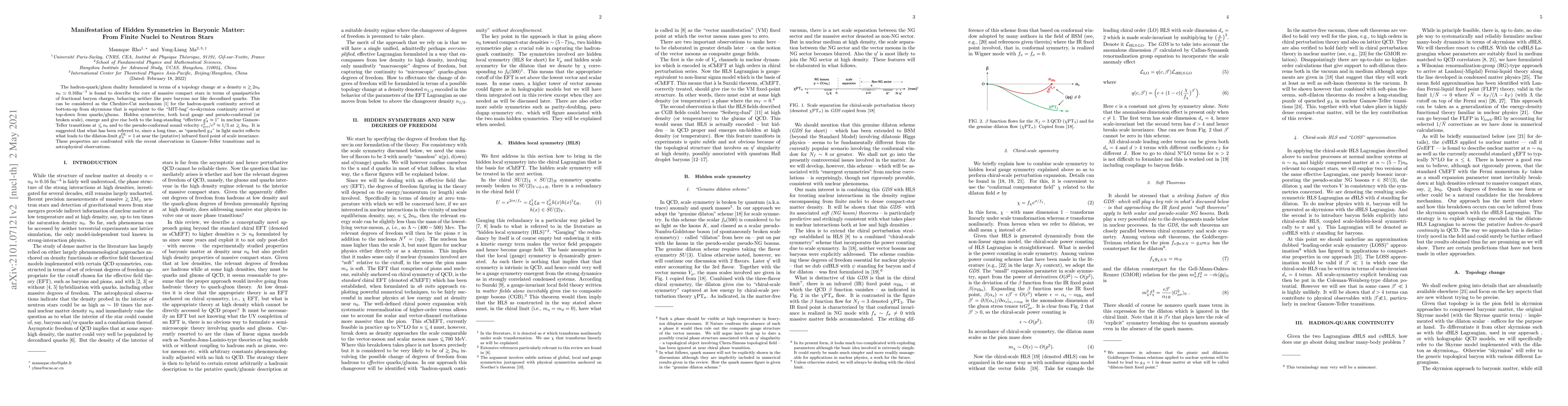 The hadron-quark/gluon duality formulated in terms of a topology change at a density $n\gsim 2n_0$ $n_0\simeq 0.16$fm$^{-3}$ is found to describe the core of massive compact stars in terms of quasiparticles of fractional baryon charges, behaving neither like pure baryons nor like deconfined quarks. This can be considered as the Cheshire-Cat mechanism~\cite{CC} for the hadron-quark continuity arrived at bottom-up from skyrmions that is equivalent to the "MIT-bag"-to-skyrmion continuity arrived at top-down from quarks/gluons. Hidden symmetries, both local gauge and pseudo-conformal (or broken scale), emerge and give rise both to the long-standing "effective $g_A^\ast\approx 1$" in nuclear Gamow-Teller transitions at $\lsim n_0$ and to the pseudo-conformal sound velocity $v_{pcs}^2/c^2\approx 1/3$ at $\gsim 3n_0$. It is suggested that what has been referred to, since a long time, as "quenched $g_A$" in light nuclei reflects what leads to the dilaton-limit $g_A^{\rm DL}=1$ at near the (putative) infrared fixed point of scale invariance. These properties are confronted with the recent observations in Gamow-Teller transitions and in astrophysical observations.