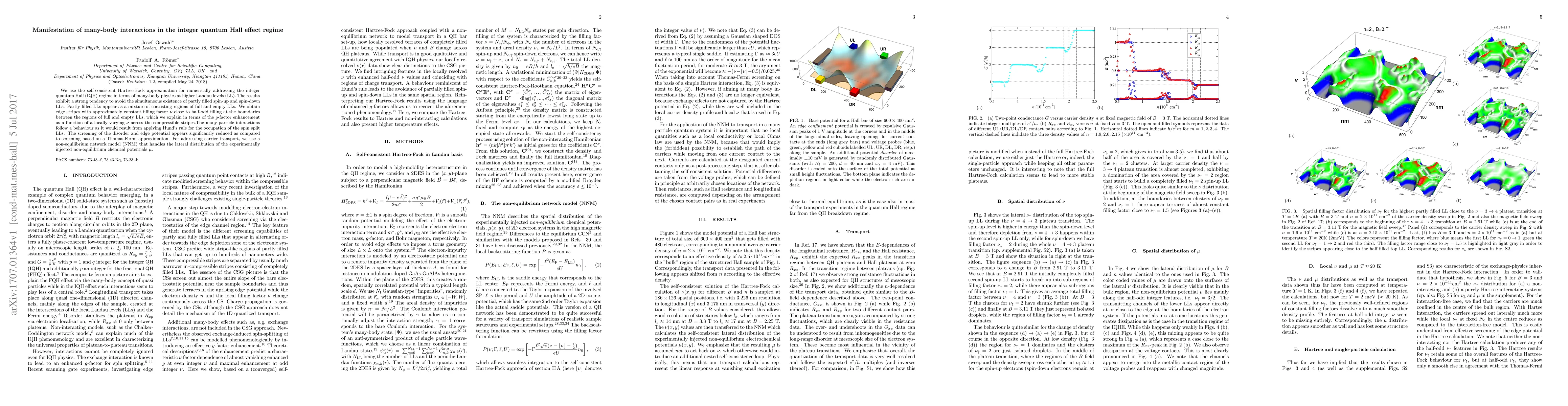 We use the self-consistent Hartree-Fock approximation for numerically addressing the integer quantum Hall (IQH) regime in terms of many-body physics at higher Landau levels (LL). The results exhibit a strong tendency to avoid the simultaneous existence of partly filled spin-up and spin-down LLs. Partly filled LLs appear as a mixture of coexisting regions of full and empty LLs. We obtain edge stripes with approximately constant filling factor $\nu$ close to half-odd filling at the boundaries between the regions of full and empty LLs, which we explain in terms of the $g$-factor enhancement as a function of a locally varying $\nu$ across the compressible stripes.The many-particle interactions follow a behaviour as it would result from applying Hund's rule for the occupation of the spin split LLs. The screening of the disorder and edge potential appears significantly reduced as compared to screening based on a Thomas-Fermi approximation. For addressing carrier transport, we use a non-equilibrium network model (NNM) that handles the lateral distribution of the experimentally injected non-equilibrium chemical potentials $\mu$.