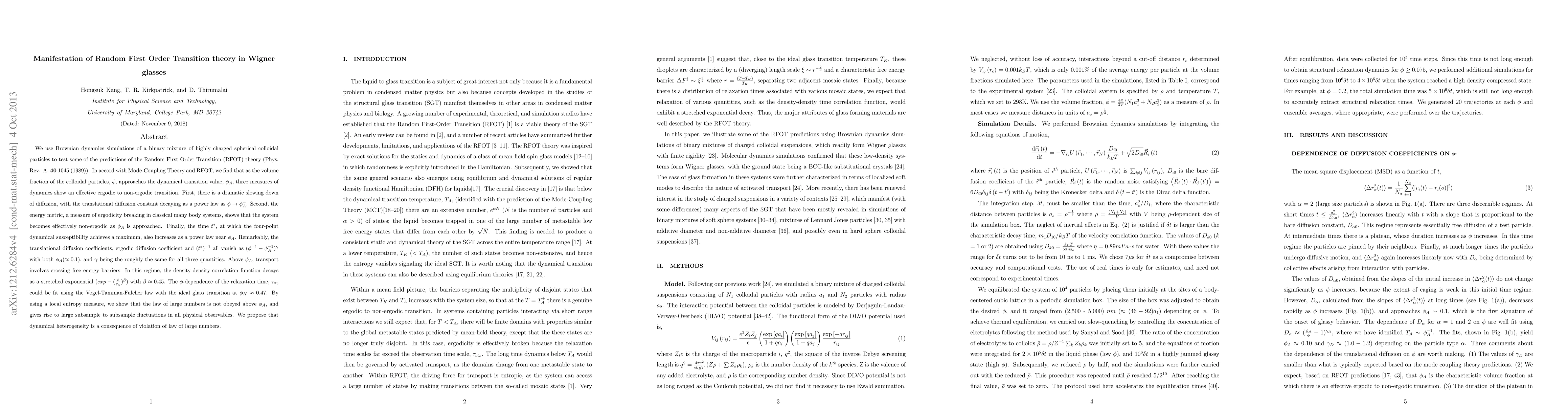 This research validates the Random First Order Transition (RFOT) theory using Brownian dynamics simulations of charged colloidal particles. Key findings include an ergodic-nonergodic dynamical transition, diverging time scale, and collapse of various measures at a critical volume fraction, f_A, indicating glass transition and breaking of ergodicity. The study supports RFOT's unified description of liquid-to-glass transition statics and dynamics.