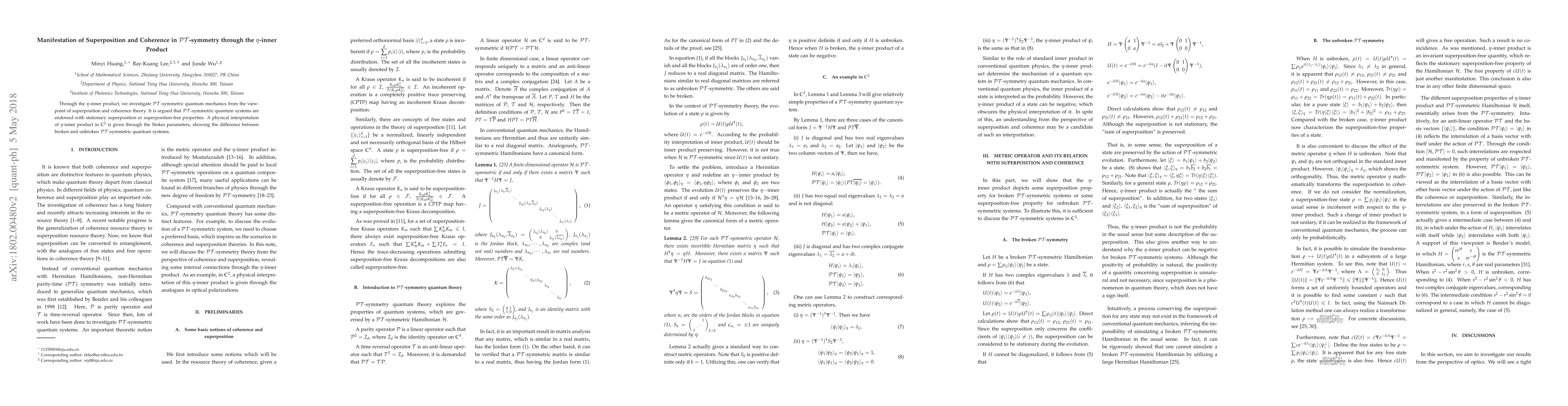Through the $\eta$-inner product, we investigate $\cal PT$-symmetric quantum mechanics from the viewpoint of superposition and coherence theory. It is argued that $\cal PT$-symmetric quantum systems are endowed with stationary superposition or superposition-free properties. A physical interpretation of $\eta$-inner product in $\mathbb C^2$ is given through the Stokes parameters, showing the difference between broken and unbroken $\cal PT$-symmetric quantum systems.