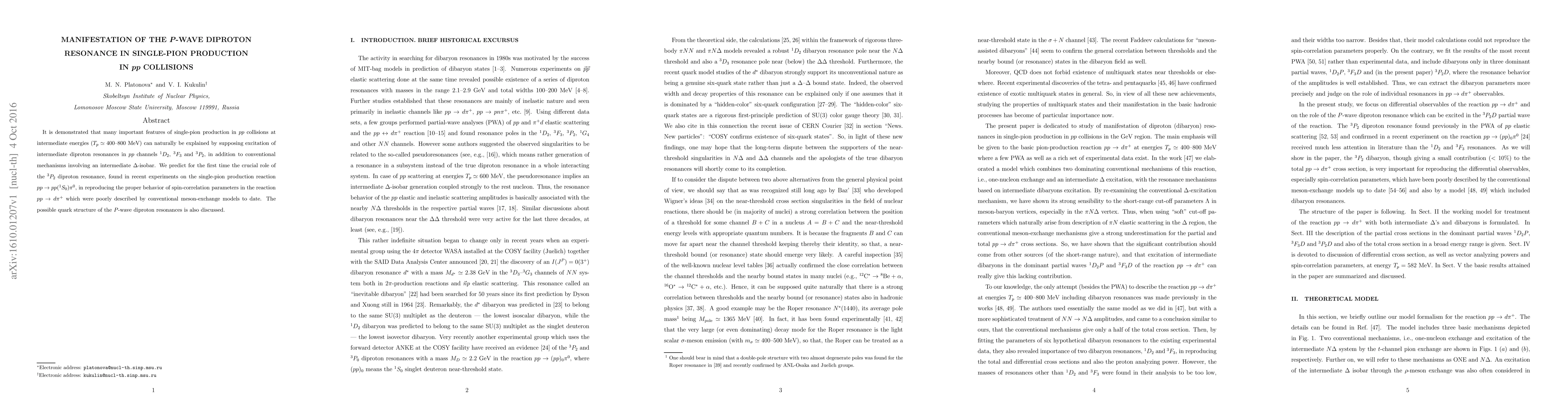 It is demonstrated that many important features of single-pion production in $pp$ collisions at intermediate energies ($T_p \simeq 400$-$800$ MeV) can naturally be explained by supposing excitation of intermediate diproton resonances in $pp$ channels ${}^1D_2$, ${}^3F_3$ and ${}^3P_2$, in addition to conventional mechanisms involving an intermediate $\Delta$-isobar. We predict for the first time the crucial role of the ${}^3P_2$ diproton resonance, found in recent experiments on the single-pion production reaction $pp \to pp({}^1S_0) \pi^0$, in reproducing the proper behavior of spin-correlation parameters in the reaction $pp \to d \pi^+$ which were poorly described by conventional meson-exchange models to date. The possible quark structure of the $P$-wave diproton resonances is also discussed.