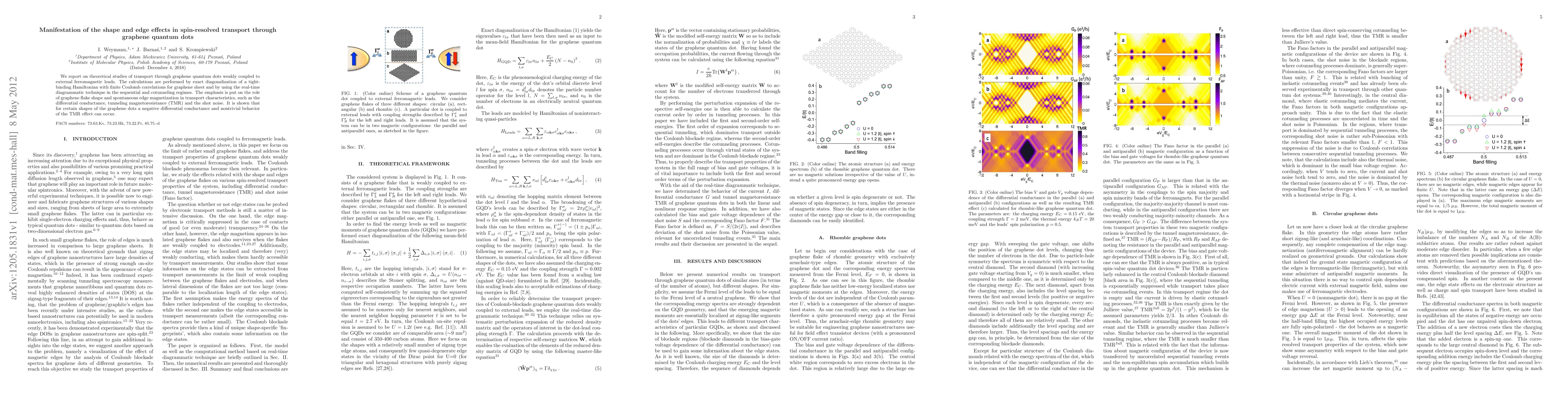 This paper investigates spin-resolved transport through graphene quantum dots connected to ferromagnetic leads, focusing on the effects of graphene shape and edge magnetization. It reveals that specific shapes can lead to negative differential conductance and unique tunneling magnetoresistance behaviors.