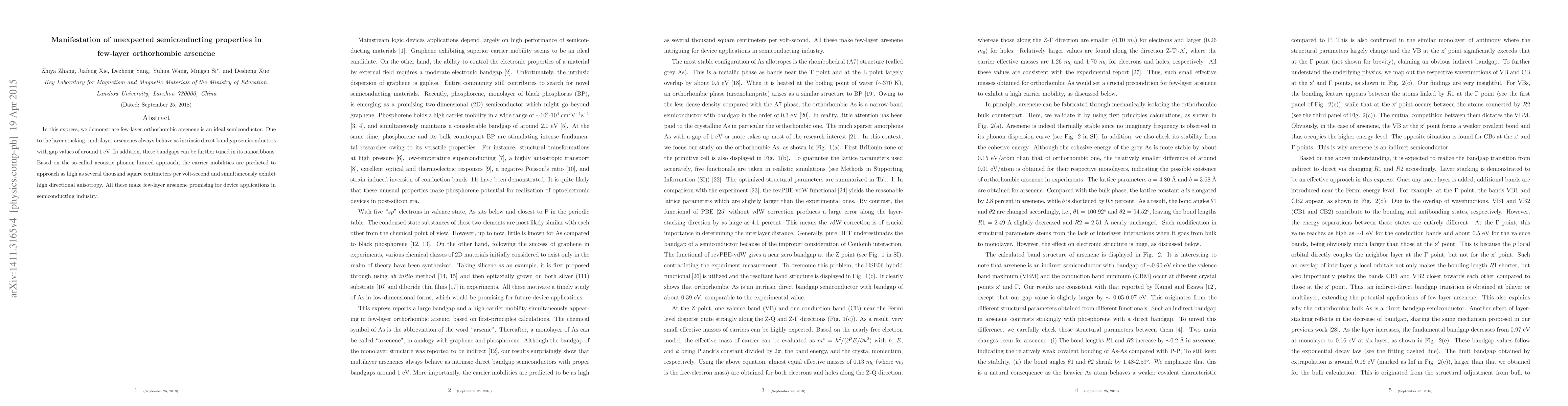 Few-layer orthorhombic arsenene exhibits intrinsic direct bandgap semiconductor properties with tunable gaps and high carrier mobilities, making it a promising material for device applications.
