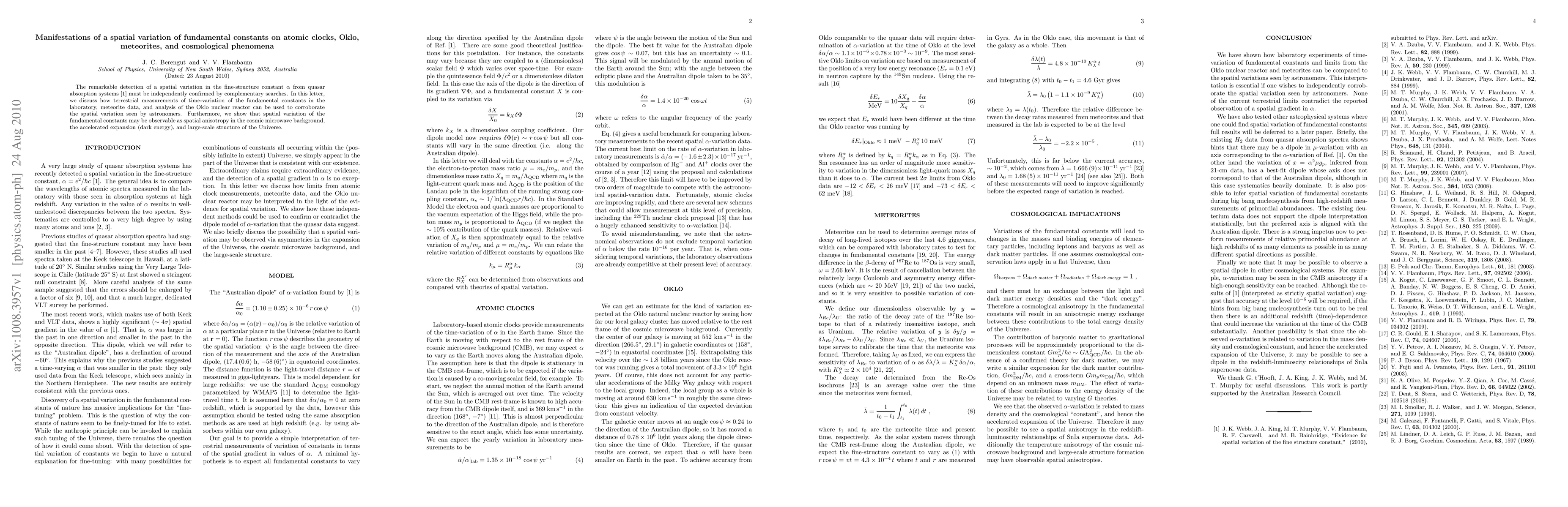 This paper explores the potential corroboration of a spatial variation in the fine-structure constant, alpha, through laboratory measurements, meteorite data, and Oklo reactor analysis. It also suggests that such variations could manifest in cosmic microwave background anisotropy, dark energy, and the large-scale structure of the Universe.