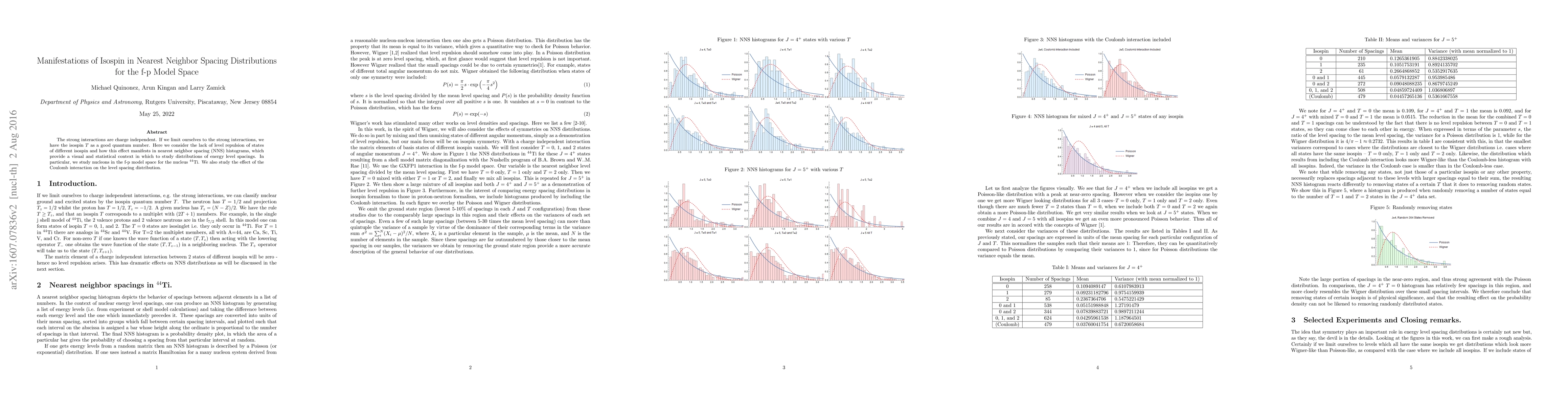 The strong interactions are charge independent. If we limit ourselves to the strong interactions, we have the isospin $T$ as a good quantum number. Here we consider the lack of level repulsion of states of different isospin and how this effect manifests in nearest neighbor spacing (NNS) histograms, which provide a visual and statistical context in which to study distributions of energy level spacings. In particular, we study nucleons in the f-p model space for the nucleus $^{44}$Ti. We also study the effect of the Coulomb interaction on the level spacing distribution.