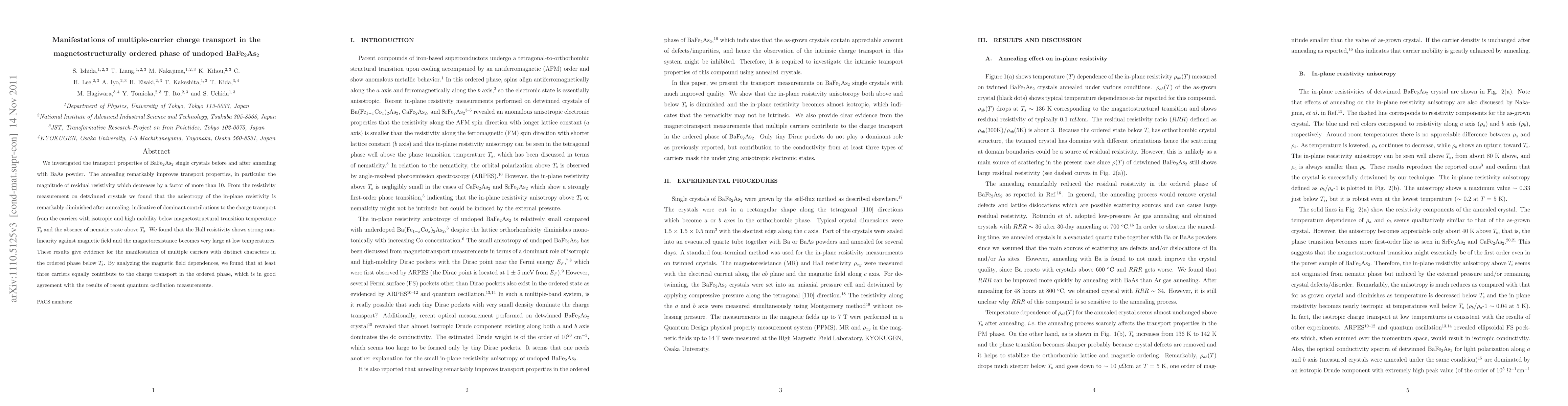 We investigated the transport properties of BaFe$_2$As$_2$ single crystals before and after annealing with BaAs powder. The annealing remarkably improves transport properties, in particular the magnitude of residual resistivity which decreases by a factor of more than 10. From the resistivity measurement on detwinned crystals we found that the anisotropy of the in-plane resistivity is remarkably diminished after annealing, indicative of dominant contributions to the charge transport from the carriers with isotropic and high mobility below magnetostructural transition temperature $T_{\rm s}$ and the absence of nematic state above $T_{\rm s}$. We found that the Hall resistivity shows strong non-linearity against magnetic field and the magnetoresistance becomes very large at low temperatures. These results give evidence for the manifestation of multiple carriers with distinct characters in the ordered phase below $T_{\rm s}$. By analyzing the magnetic field dependences, we found that at least three carriers equally contribute to the charge transport in the ordered phase, which is in good agreement with the results of recent quantum oscillation measurements.