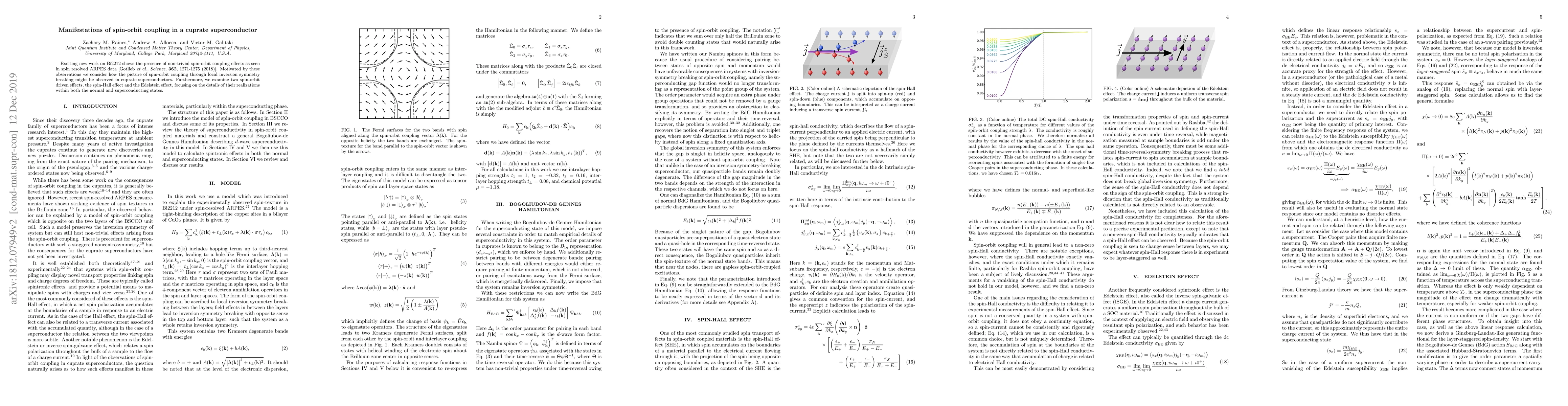 The research explores spin-orbit coupling in Bi2212 cuprate superconductor, confirming its presence via spin-resolved ARPES data. It discusses the manifestation of spin-orbit effects, namely the spin-Hall and Edelstein effects, in both normal and superconducting states.