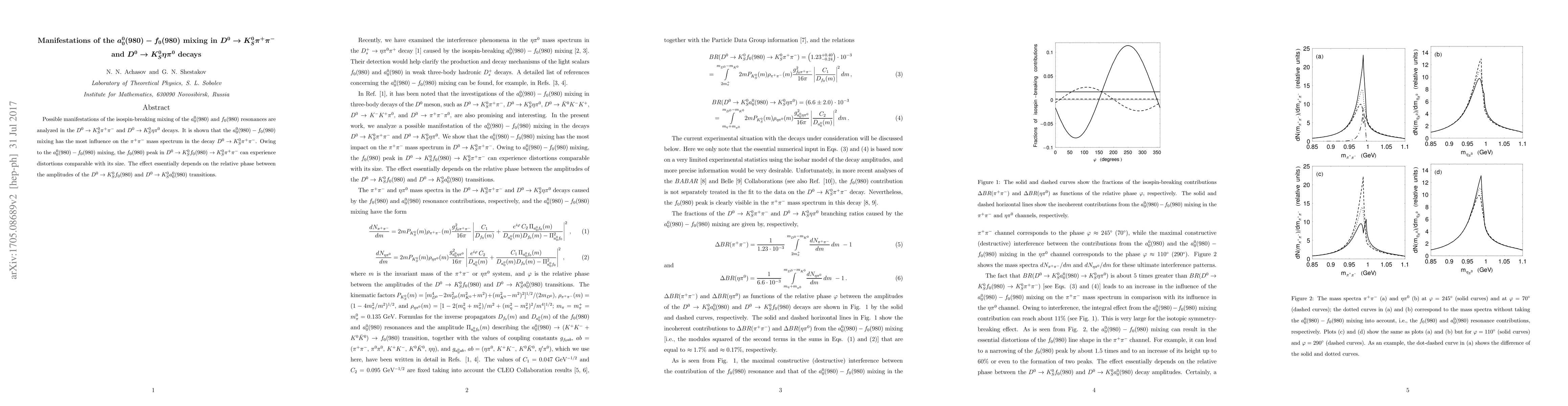 This paper analyzes the isospin-breaking mixing between the $a^0_0(980)$ and $f_0(980)$ resonances in $D^0$ decay processes, finding significant influence on the $\pi^+\pi^-$ mass spectrum in $D^0\to K^0_S\pi^+\pi^-$ due to this mixing, which can distort the $f_0(980)$ peak size.