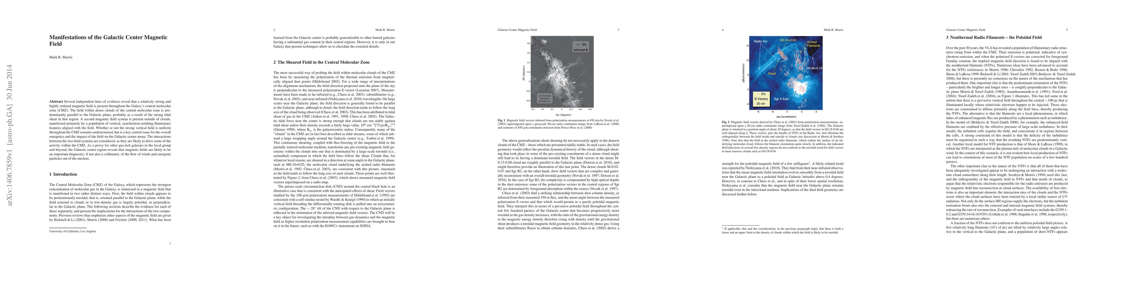 Several independent lines of evidence reveal that a relatively strong and highly ordered magnetic field is present throughout the Galaxy's central molecular zone (CMZ). The field within dense clouds of the central molecular zone is predominantly parallel to the Galactic plane, probably as a result of the strong tidal shear in that region. A second magnetic field system is present outside of clouds, manifested primarily by a population of vertical, synchrotron-emitting filamentary features aligned with the field. Whether or not the strong vertical field is uniform throughout the CMZ remains undetermined, but is a key central issue for the overall energetics and the impact of the field on the Galactic center arena. The interactions between the two field systems are considered, as they are likely to drive some of the activity within the CMZ. As a proxy for other gas-rich galaxies in the local group and beyond, the Galactic center region reveals that magnetic fields are likely to be an important diagnostic, if not also a collimator, of the flow of winds and energetic particles out of the nucleus.