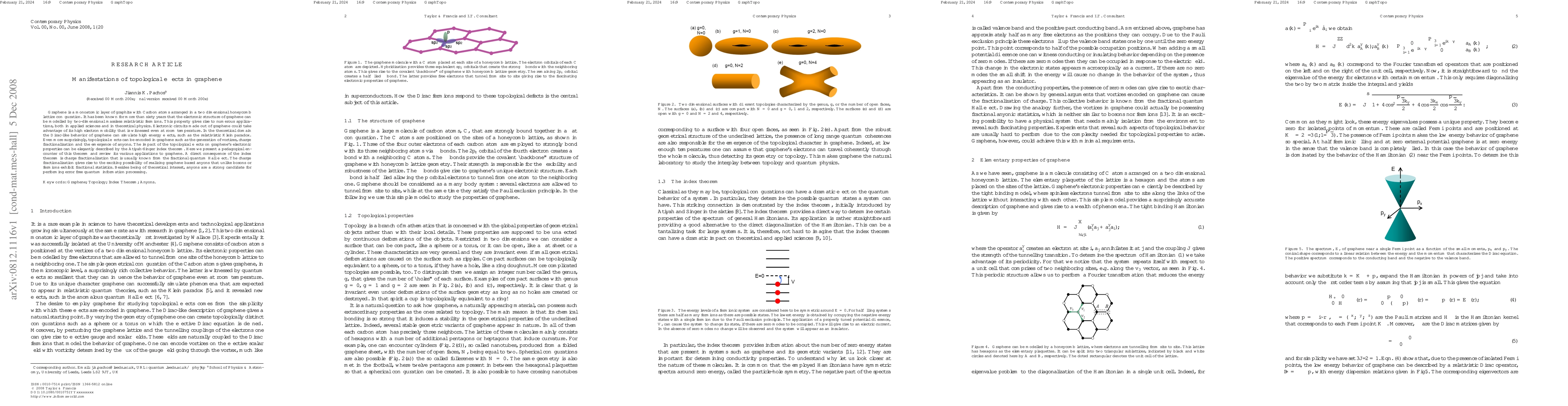This paper explores the topological effects in graphene, highlighting its Dirac-like behavior and the emergence of anyons, which exhibit fractional statistics and hold promise for error-free quantum information processing. The Atiyah-Singer index theorem is used to describe these phenomena, including charge fractionalization akin to the fractional quantum Hall effect.