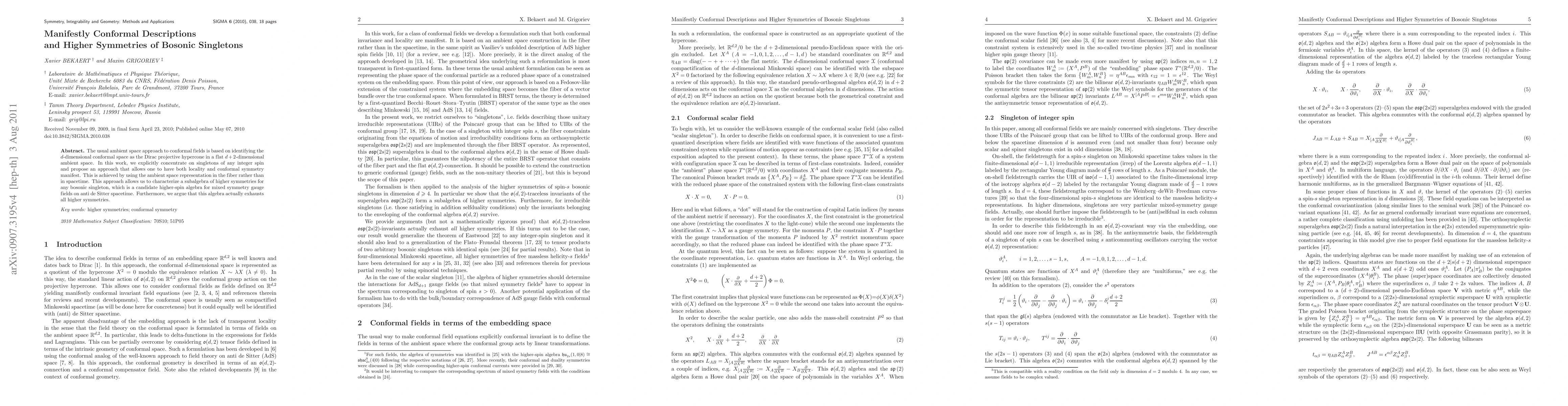 The usual ambient space approach to conformal fields is based on identifying the d-dimensional conformal space as the Dirac projective hypercone in a flat d+2-dimensional ambient space. In this work, we explicitly concentrate on singletons of any integer spin and propose an approach that allows one to have both locality and conformal symmetry manifest. This is achieved by using the ambient space representation in the fiber rather than in spacetime. This approach allows us to characterize a subalgebra of higher symmetries for any bosonic singleton, which is a candidate higher-spin algebra for mixed symmetry gauge fields on anti de Sitter spacetime. Furthermore, we argue that this algebra actually exhausts all higher symmetries.