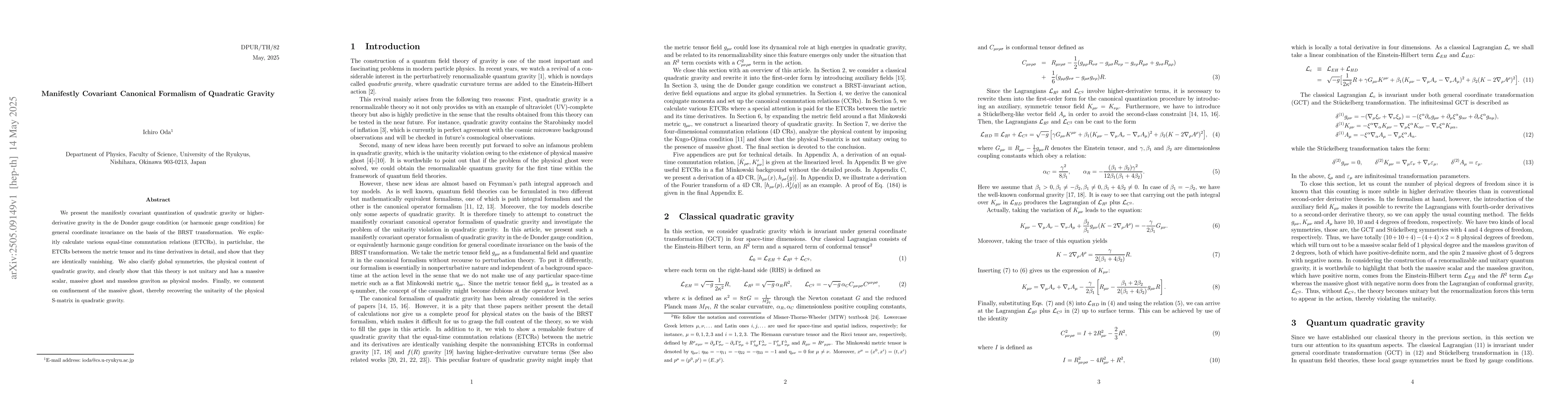 The research presents a manifestly covariant quantization of quadratic gravity using the BRST transformation, with detailed calculations of equal-time commutation relations (ETCRs) in the de Donder gauge condition.