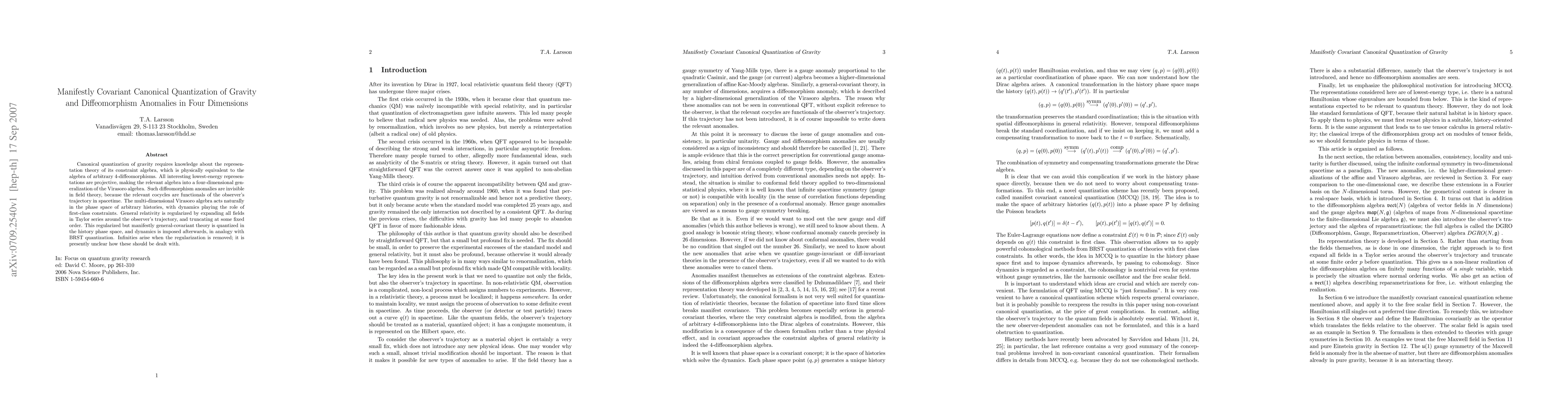 Canonical quantization of gravity requires knowledge about the representation theory of its constraint algebra, which is physically equivalent to the algebra of arbitrary 4-diffeomorphisms. All interesting lowest-energy representations are projective, making the relevant algebra into a four-dimensional generalization of the Virasoro algebra. Such diffeomorphism anomalies are invisible in field theory, because the relevant cocycles are functionals of the observer's trajectory in spacetime. The multi-dimensional Virasoro algebra acts naturally in the phase space of arbitrary histories, with dynamics playing the role of first-class constraints. General relativity is regularized by expanding all fields in Taylor series around the observer's trajectory, and truncating at some fixed order. This regularized but manifestly general-covariant theory is quantized in the history phase space, and dynamics is imposed afterwards, in analogy with BRST quantization. Infinities arise when the regularization is removed; it is presently unclear how these should be dealt with.