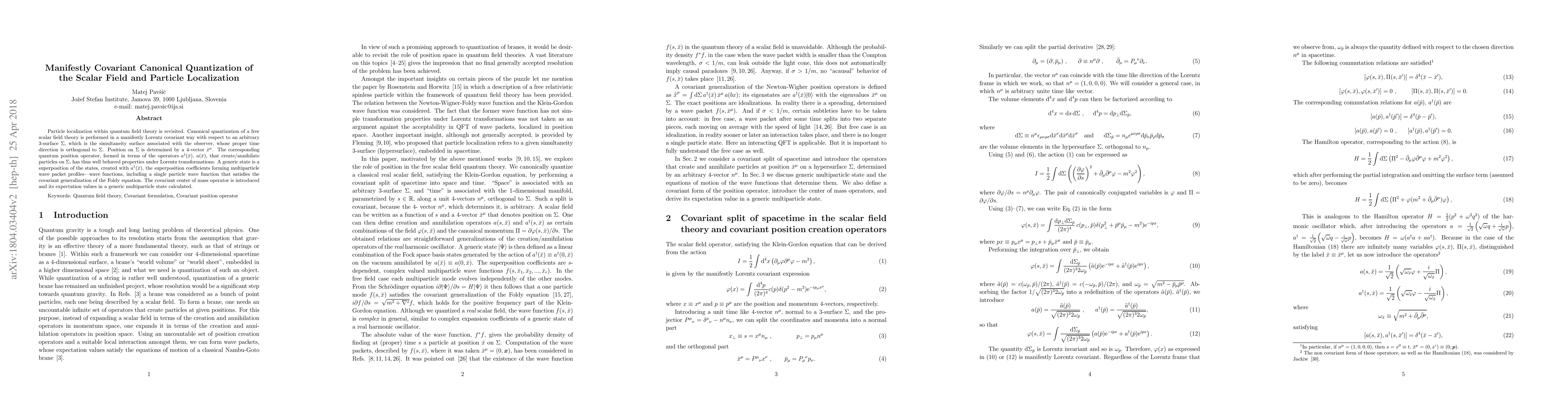 Particle localization within quantum field theory is revisited. Canonical quantization of a free scalar field theory is performed in a manifestly Lorentz covariant way with respect to an arbitrary 3-surface $\Sigma$, which is the simultaneity surface associated with the observer, whose proper time direction is orthogonal to $\Sigma$. Position on $\Sigma$ is determined by a 4-vector ${\bar x}^\mu$. The corresponding quantum position operator, formed in terms of the operators $a^\dagger ({\bar x})$, $a({\bar x})$, that create/annihilate particles on $\Sigma$, has thus well behaved properties under Lorentz transformations. A generic state is a superposition of the states, created with $a^\dagger ({\bar x})$, the superposition coefficients forming multiparticle wave packet profiles---wave functions, including a single particle wave function that satisfies the covariant generalization of the Foldy equation. The covariant center of mass operator is introduced and its expectation values in a generic multiparticle state calculated.