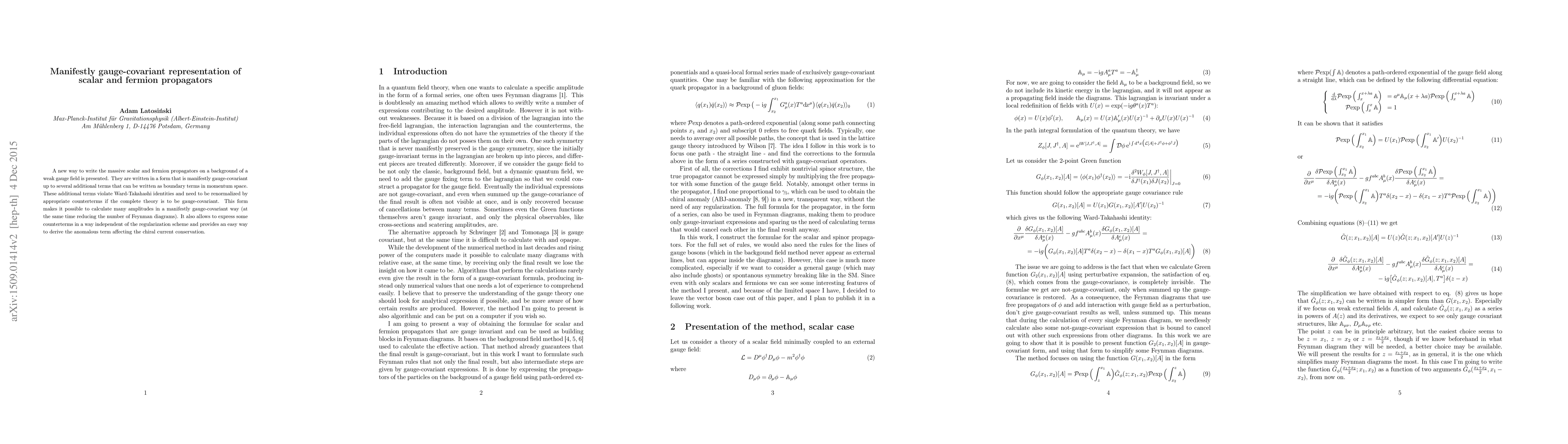 A new way to write the massive scalar and fermion propagators on a background of a weak gauge field is presented. They are written in a form that is manifestly gauge-covariant up to several additional terms that can be written as boundary terms in momentum space. These additional terms violate Ward-Takahashi identities and need to be renormalized by appropriate counterterms if the complete theory is to be gauge-covariant. This form makes it possible to calculate many amplitudes in a manifestly gauge-covariant way (at the same time reducing the number of Feynman diagrams). It also allows to express some counterterms in a way independent of the regularization scheme and provides an easy way to derive the anomalous term affecting the chiral current conservation.