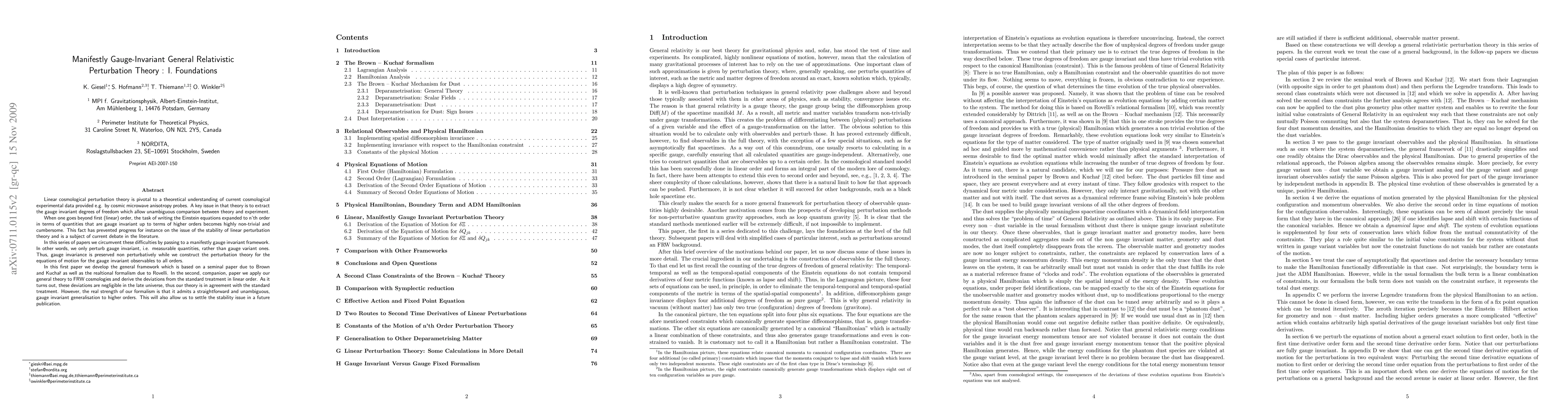 This paper establishes a manifestly gauge-invariant framework for general relativistic perturbation theory, essential for interpreting cosmological data. It develops the foundational theory based on Brown and Kuchar's and Rovelli's formalisms, aiming to simplify higher-order perturbations and resolve issues like stability, which are currently debated.